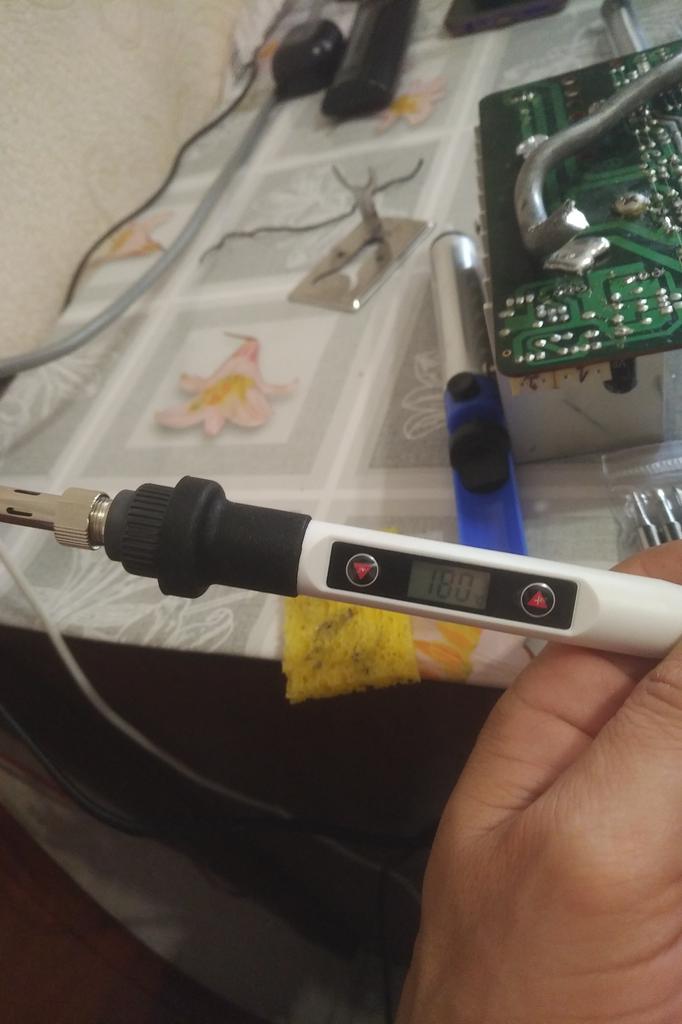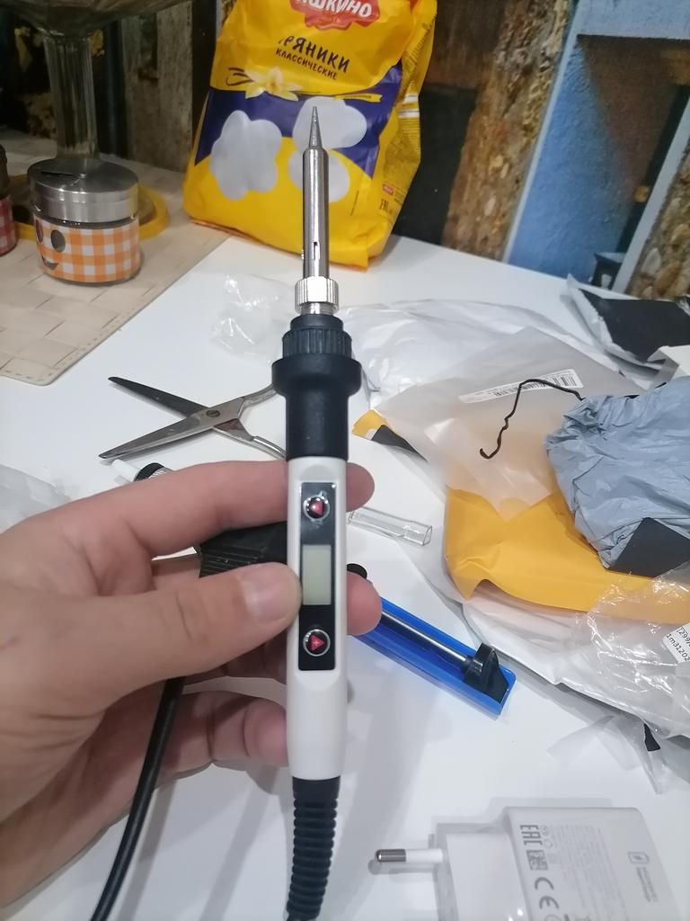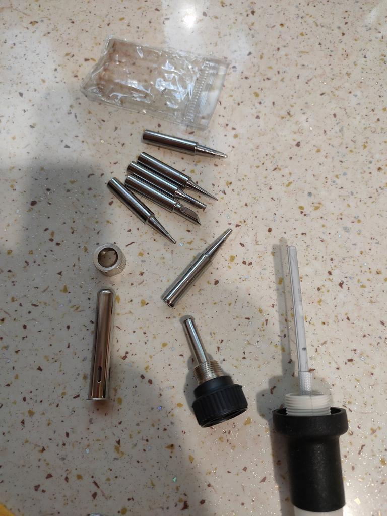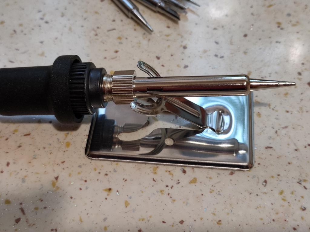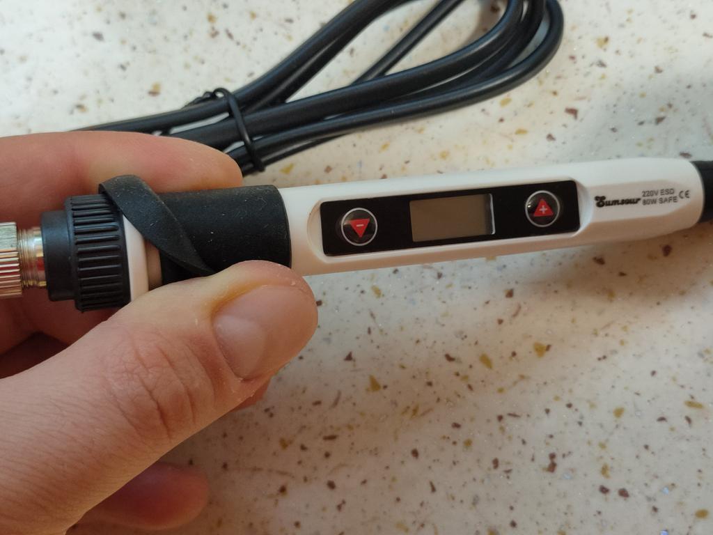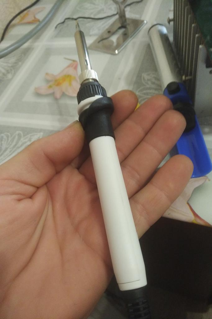 Na pierwszy rzut oka jest to lutownica wygodna, lekka, dobrze leży w dłoni, ma gumowaną rączkę i jest łatwa w demontażu. Posiada wymienne końcówki oraz stojak. Jedynym minusem jest niemetalowa nakrętka i gwint mocujący (na zdjęciu). Jeśli go upuścisz, pęknie. Sprawdzę później czy na wyświetlaczu jest ustawiona temperatura końcówki.