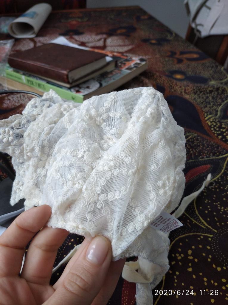 Kapelusz jest super. Z cienkiej siatki kolor masła lub ryazhenki jest tak kremowy i delikatny. Posiada podszewkę wykonaną z cienkiej, niemal przezroczystej bawełny. W przypadku krawata rozmiar nie jest regulowany. Bardzo, bardzo eleganckie i delikatne. Na jednej sznurówce jest wada, ale na pewno nie jest to krytyczna) zostanie wyprasowana. Kolejna czapka tej firmy też jest świetna!