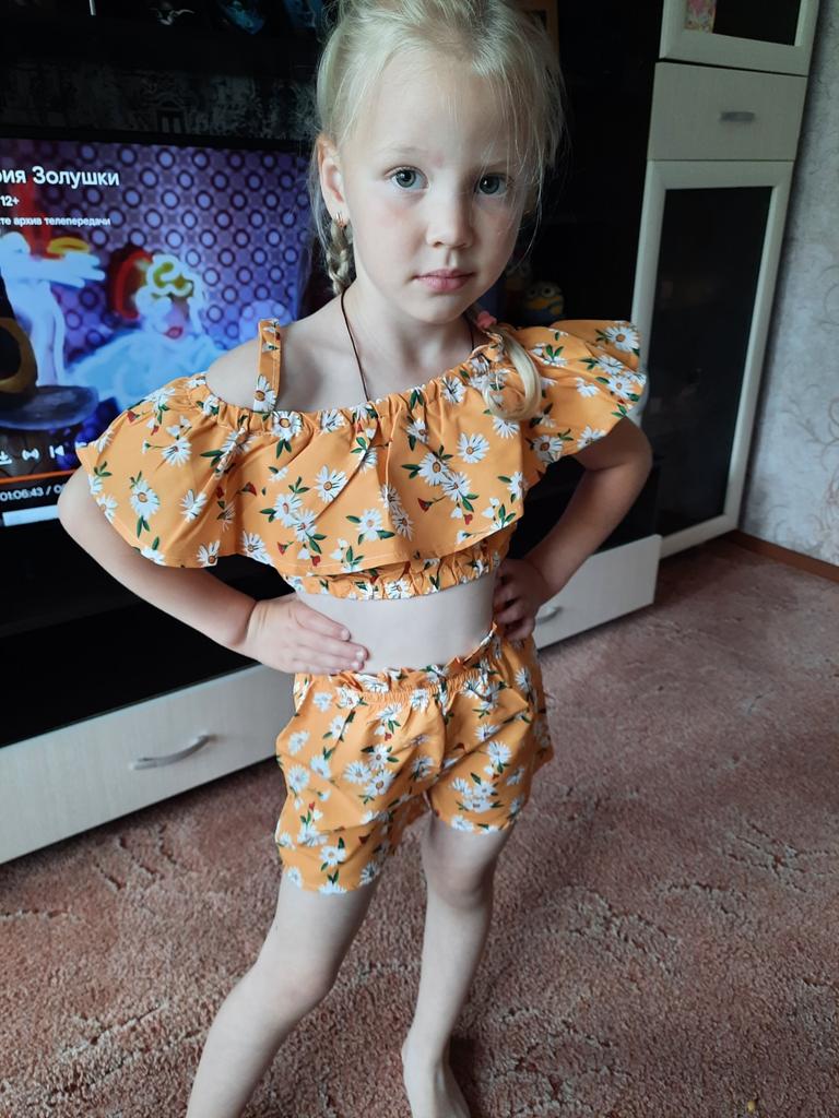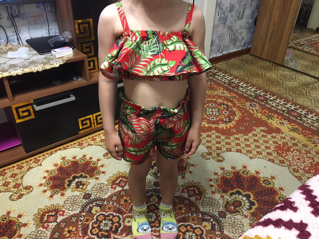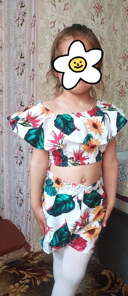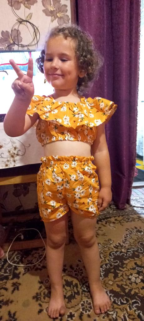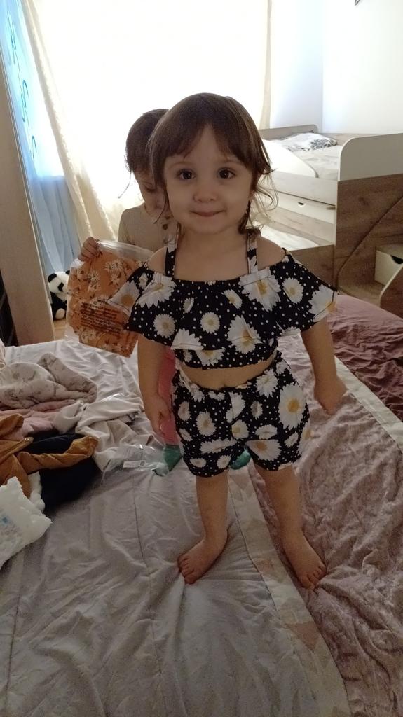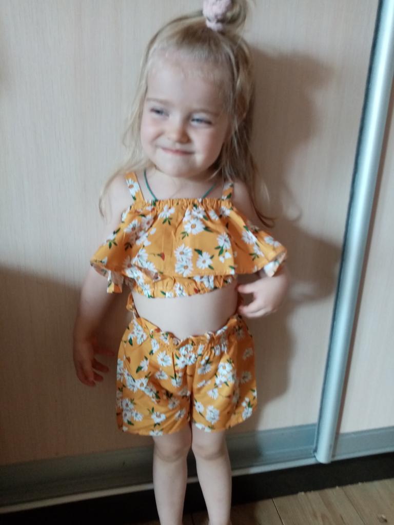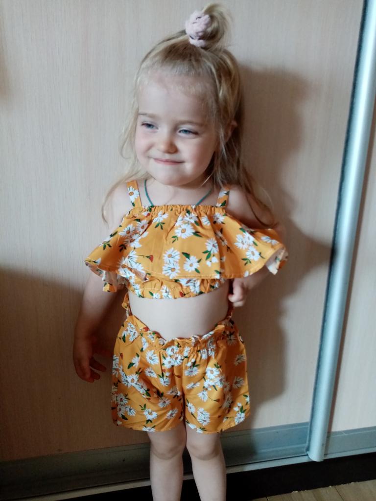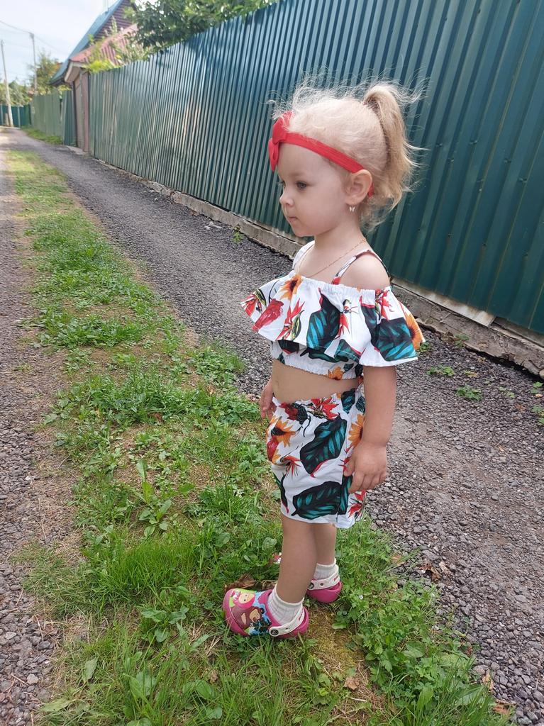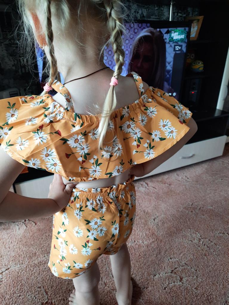 Lekki garnitur składa się z krótkiego topu i spodenek. Tkanina nie jest prześwitująca. Rozmiar zgodny z rozmiarem, na 2,5-3 lata. To idealna stylizacja na wycieczkę na plażę lub zabawę w wodzie przy basenie.. Nadruk jest bardzo stylowy i jasny💛