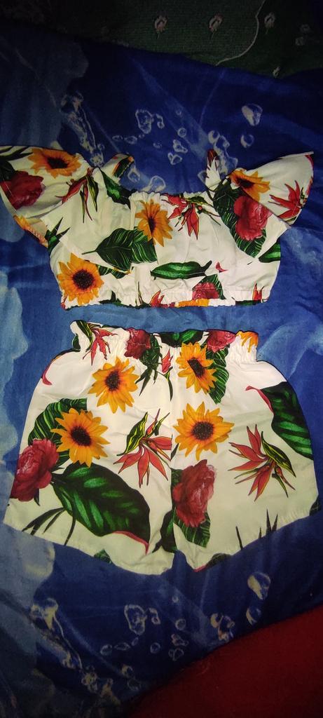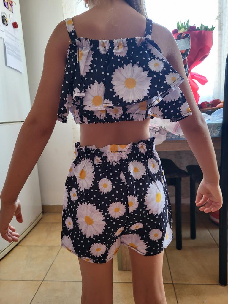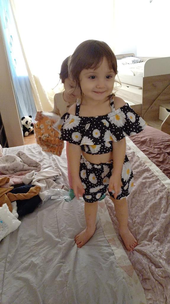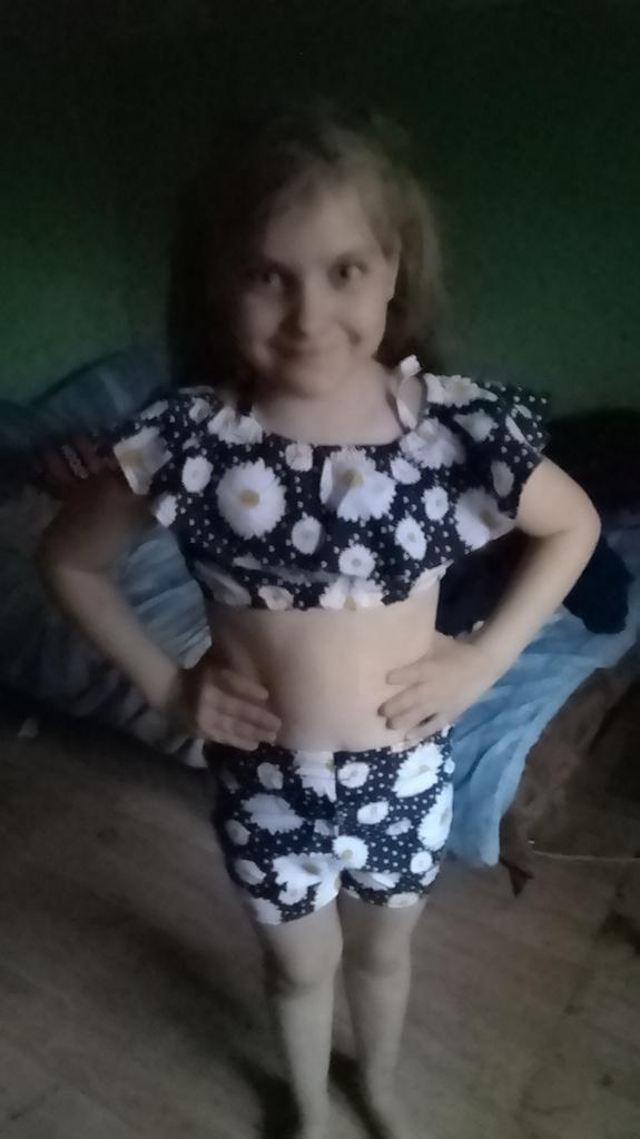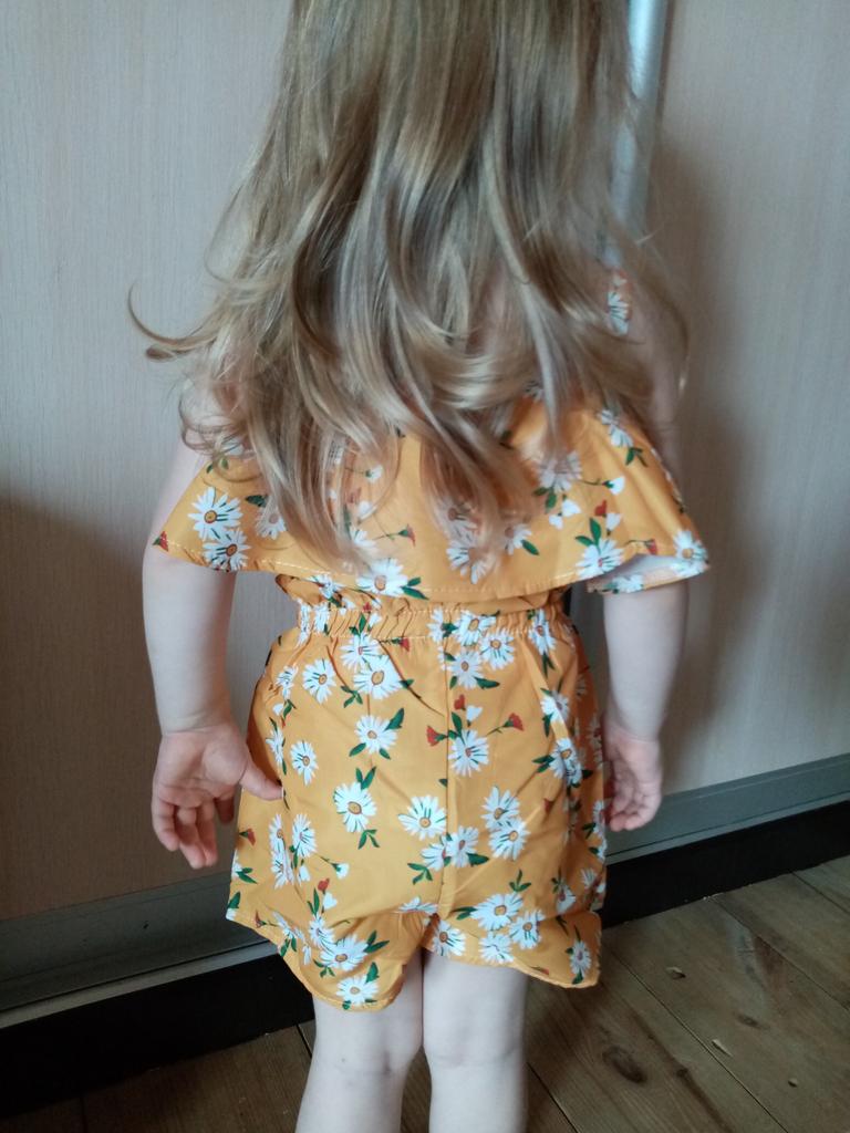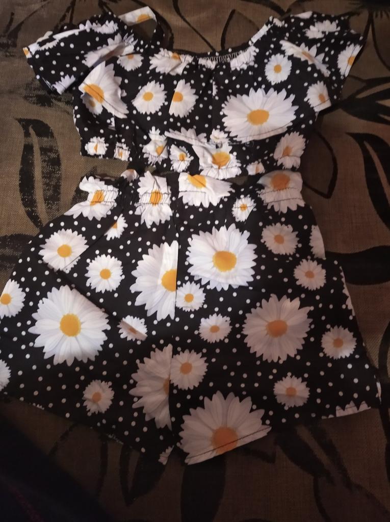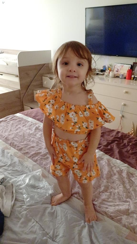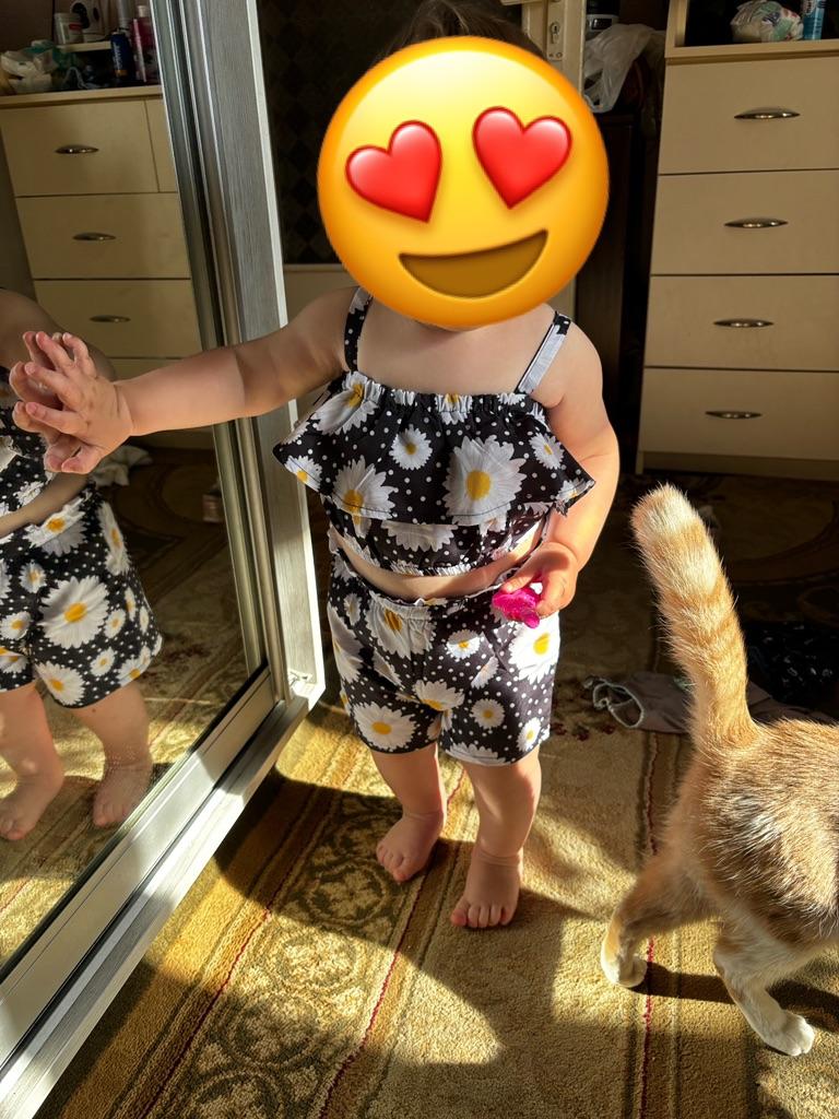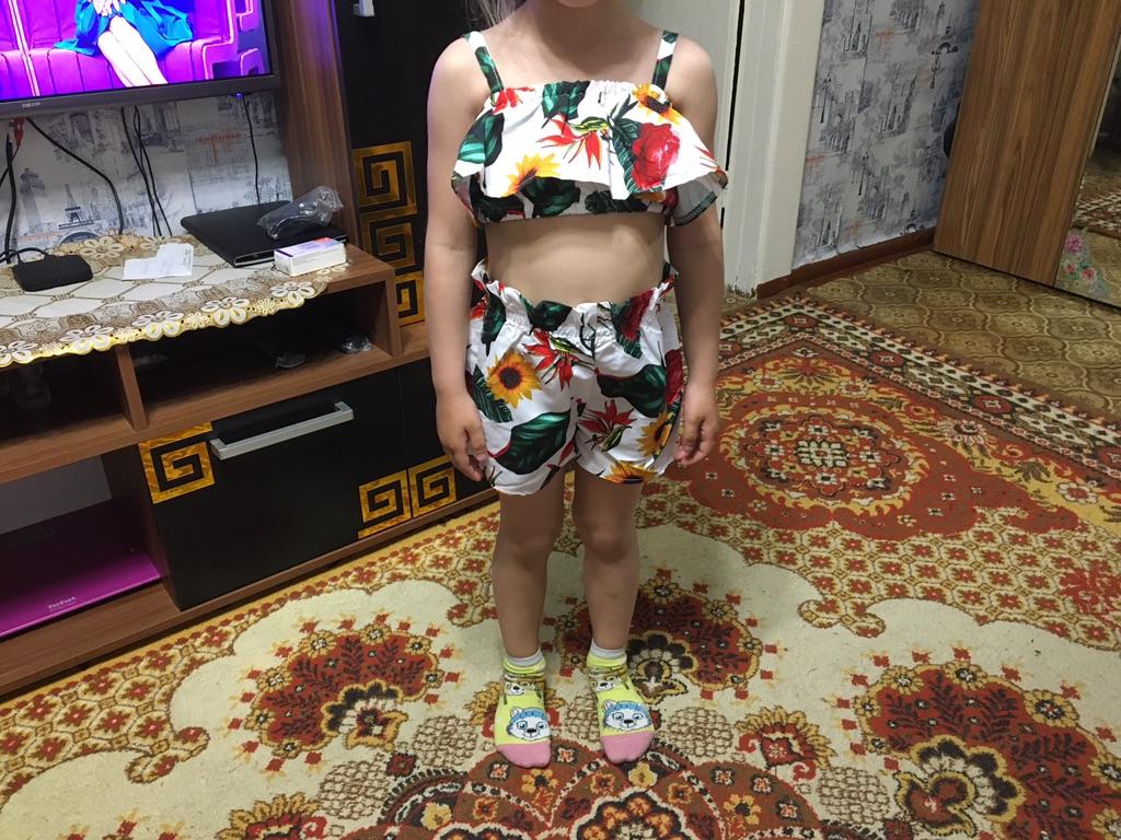 Lekki garnitur składa się z krótkiego topu i spodenek. Tkanina nie jest prześwitująca. Rozmiar zgodny z rozmiarem, na 2,5-3 lata. To idealna stylizacja na wycieczkę na plażę lub zabawę w wodzie przy basenie.. Nadruk jest bardzo stylowy i jasny💛