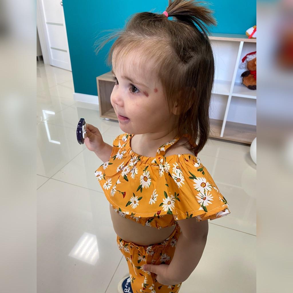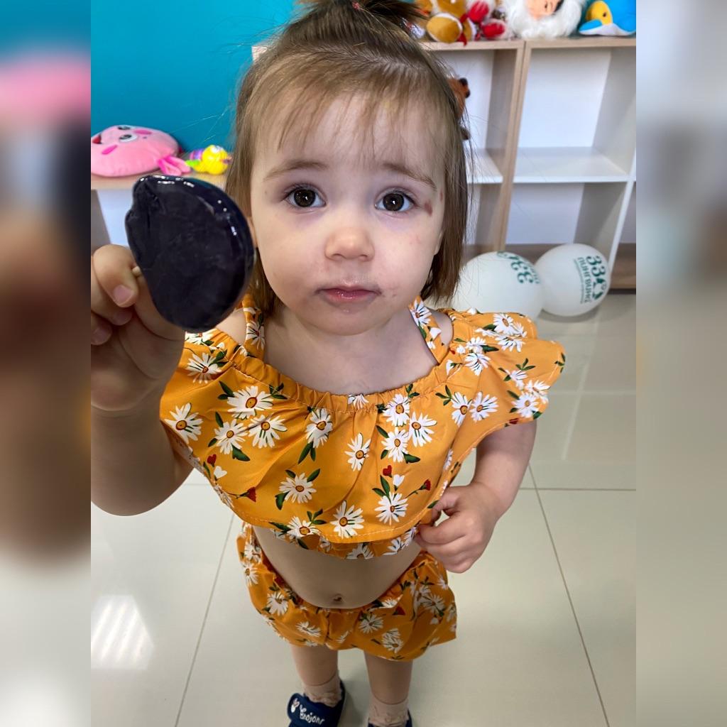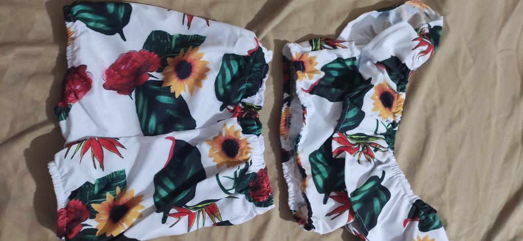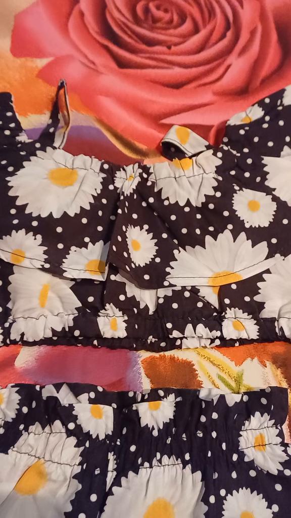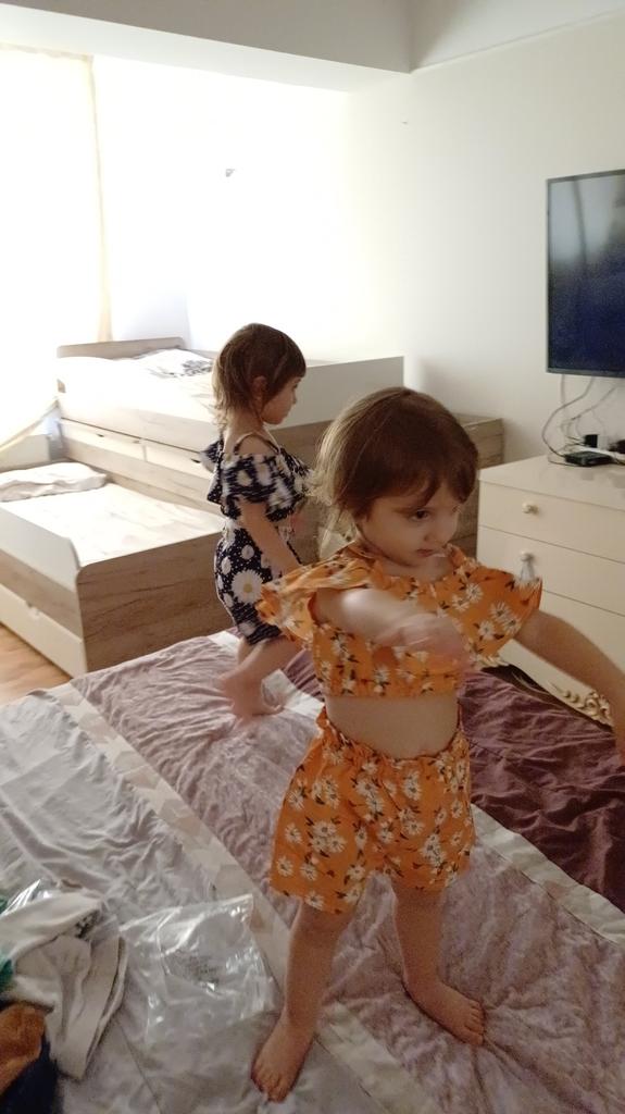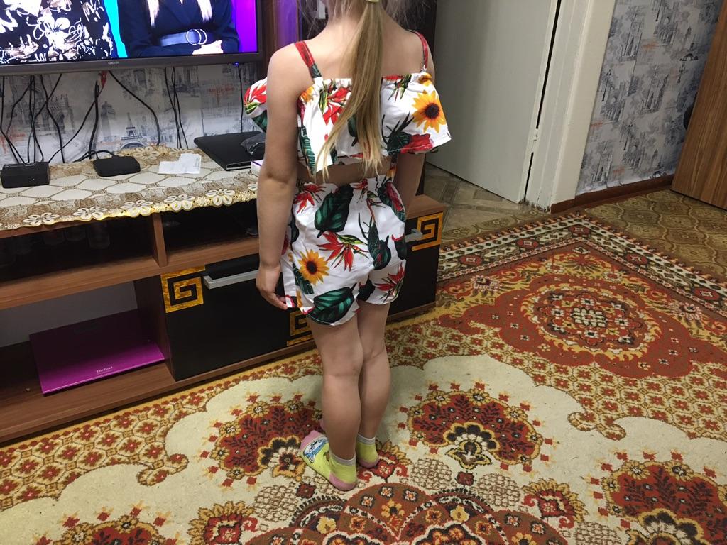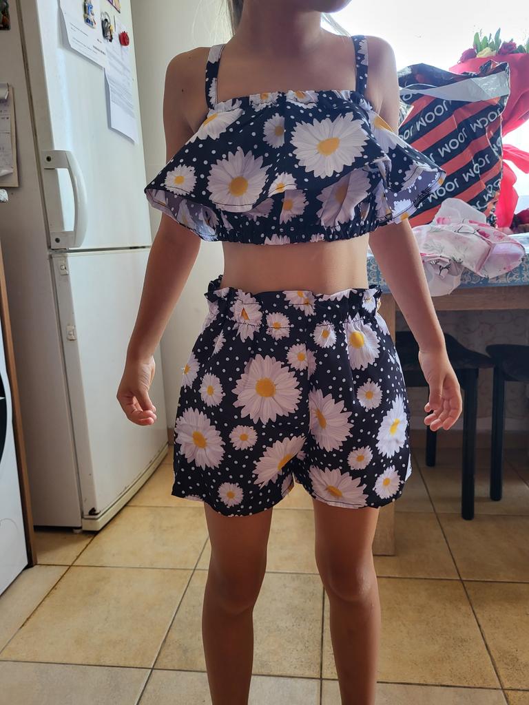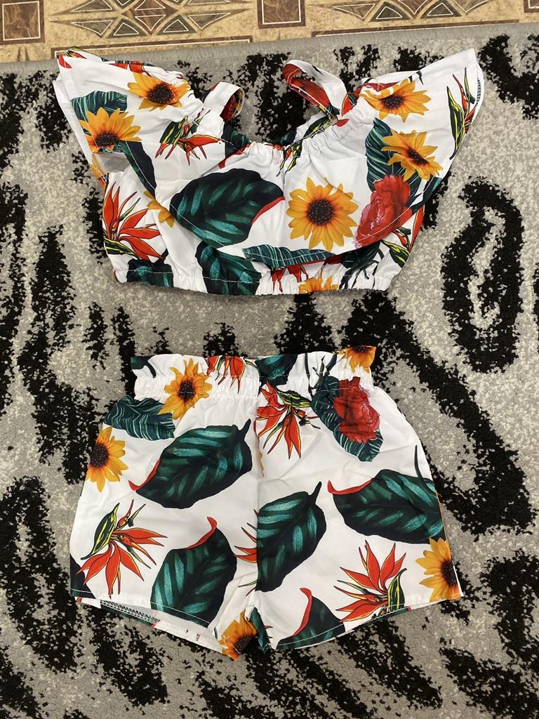 Lekki garnitur składa się z krótkiego topu i spodenek. Tkanina nie jest prześwitująca. Rozmiar zgodny z rozmiarem, na 2,5-3 lata. To idealna stylizacja na wycieczkę na plażę lub zabawę w wodzie przy basenie.. Nadruk jest bardzo stylowy i jasny💛