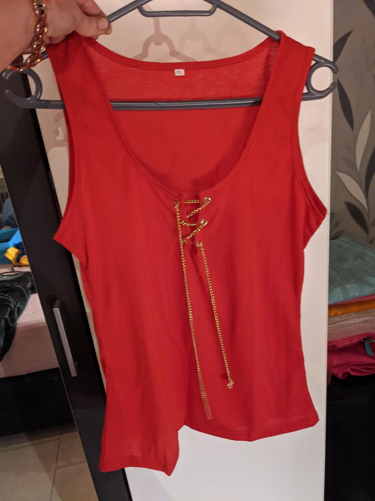 Bluzka bardzo fajna, szkoda tylko że łańcuszek nie był przewleczony.... Trzeba ściągnąć serduszko, przywlec i założyć na nowo....