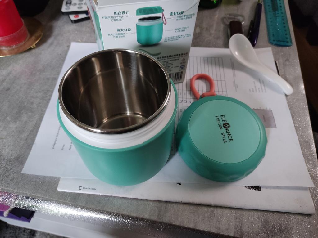 Ładny, pojemny termos, w środku mała łyżeczka z głębokim dnem na małej rączce 😉, taka słodka. Pokrywa zamyka się normalnie, jest gumowy uchwyt. Kolor jest jasnozielony, przyjemny
