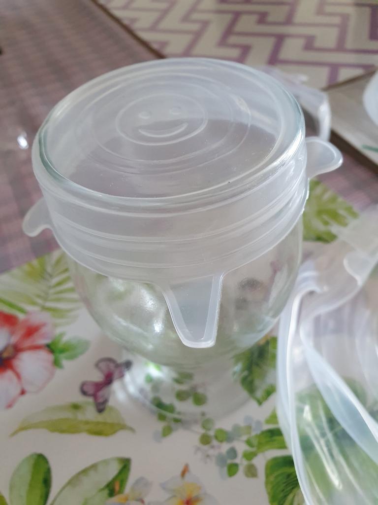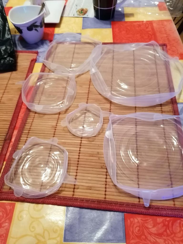 Silikonowe pokrywki na szklanki, słoiki, miski. Dość cienkie, ale elastyczne. Łatwo dopasować do odpowiedniej wielkości naczynia, bo jest ich 6 sztuk. Jakość wykonania wydaje się bardzo dobra. Polecam.
