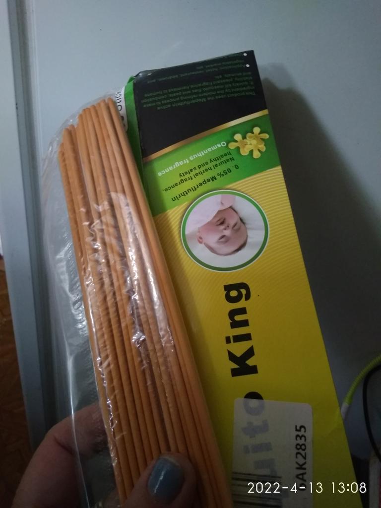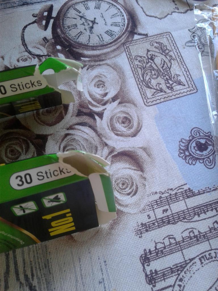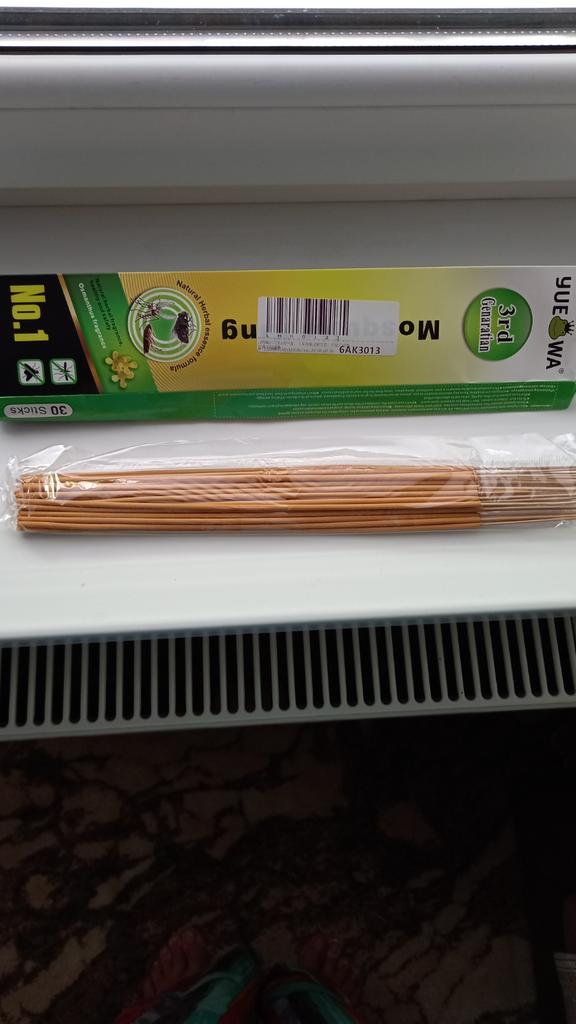 Przyszły patyki na komary. Zapakowany w folię polietylenową, owinięty taśmą (widać na 3 zdjęciu), jakby ktoś ją otworzył i potem skleił.. kartonowe opakowanie pod folią było podarte. Patyki są nienaruszone, ale jest to bardzo nieprzyjemne, jakby ktoś sięgnął do Twojego portfela! Zapal zapalniczką, zapałka nie zapala się. Ma lekki ziołowy zapach. Bardzo szybko się tli. 1/2 kija w dwadzieścia minut. Nie widzę jeszcze muszek. Będę dalej eksperymentować, dziękuję Joom za produkt.