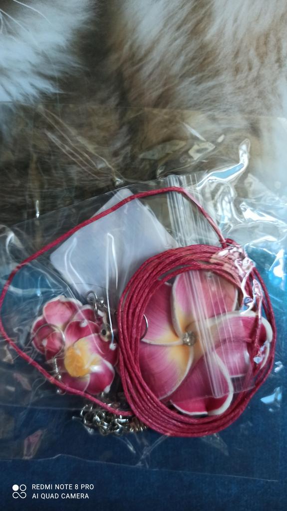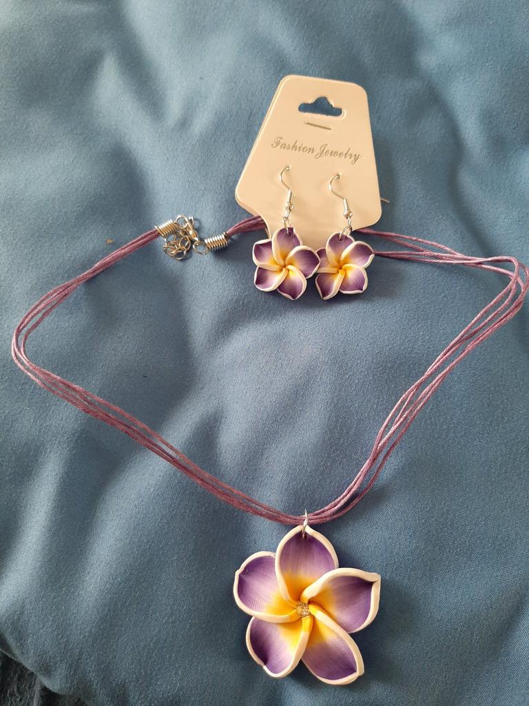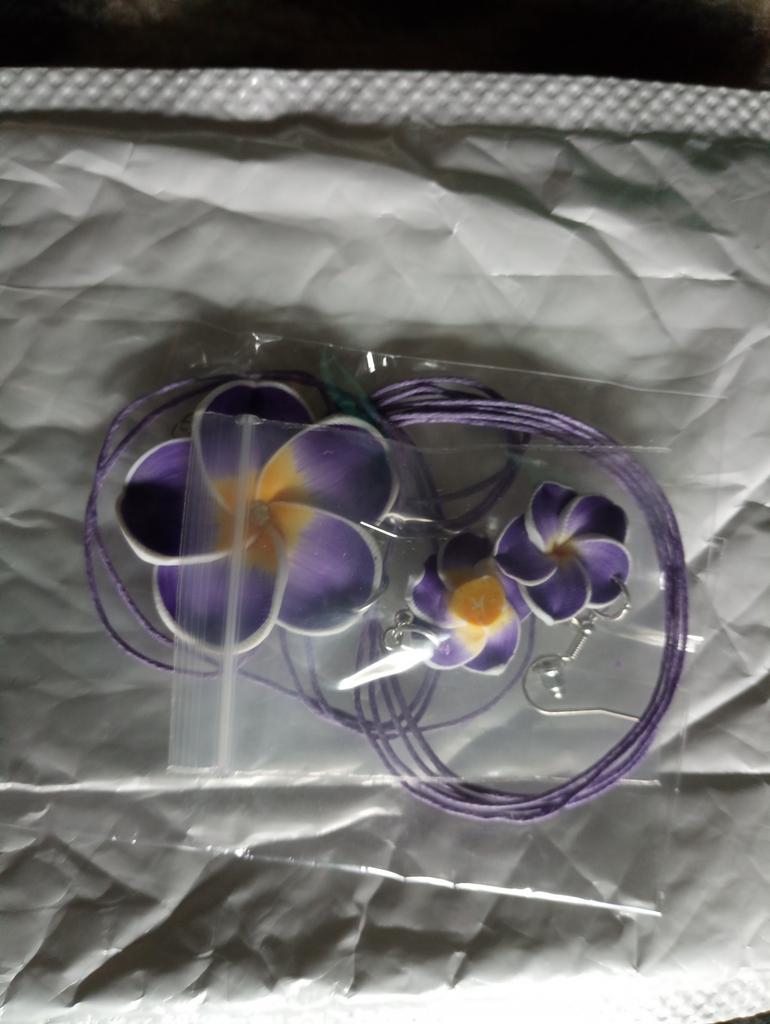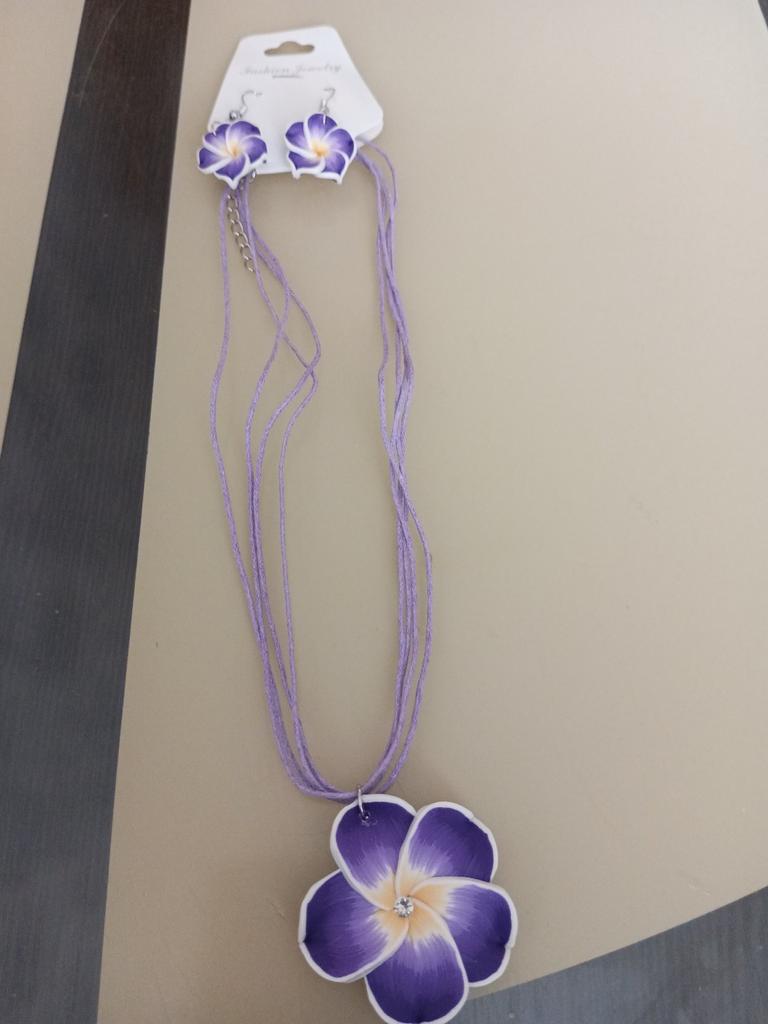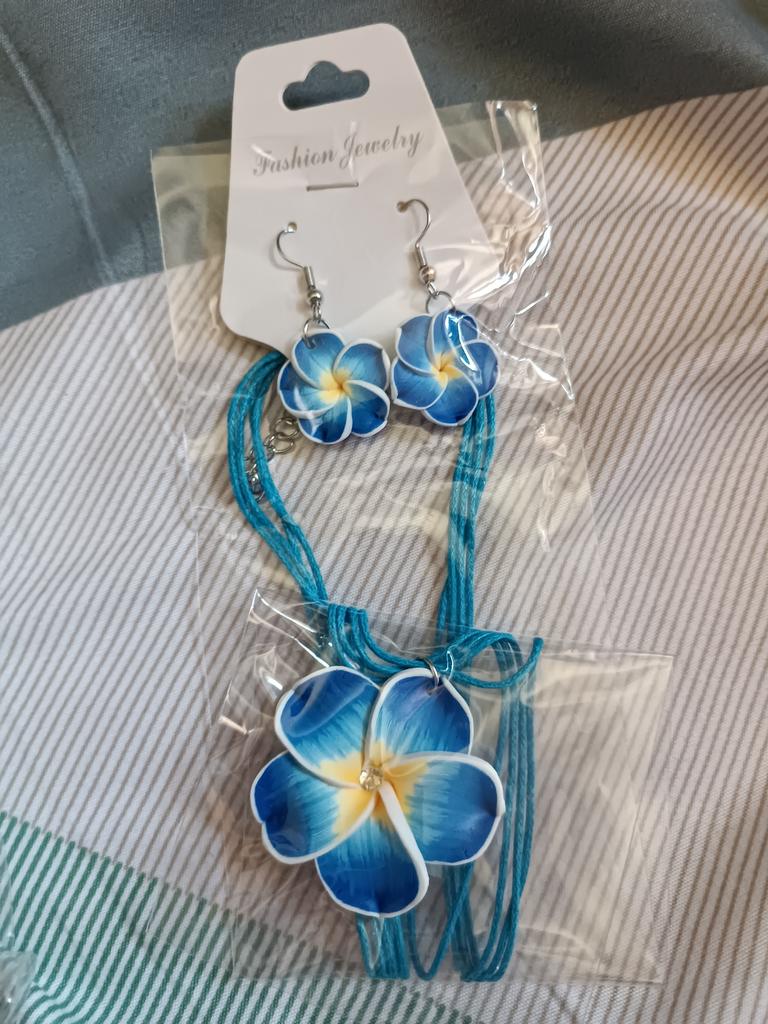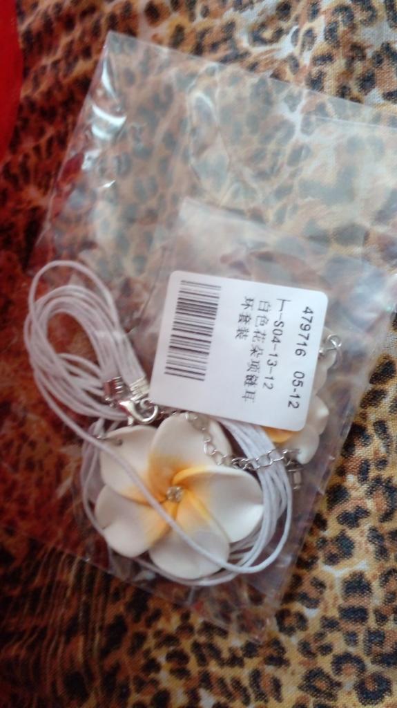 Bardzo piękny i kolorowy naszyjnik, ale kiepskiej jakości. Kolczyki nie nadają się do użytku, ponieważ haczyk został przesunięty do tyłu, więc po założeniu kolczyka na kwiatek jest skierowany do tyłu