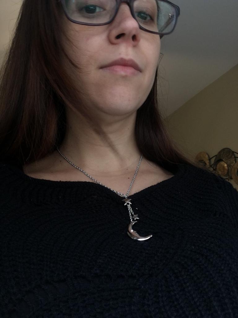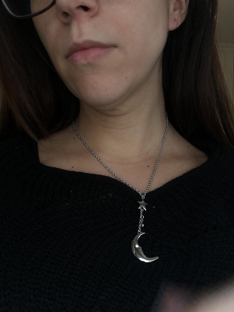 Zawieszka z księżycem i gwiazdami. Jest bardzo jasno, chociaż księżyc jest trochę duży jak na mój gust. To nic nie waży. Nosi się go bardzo wygodnie.