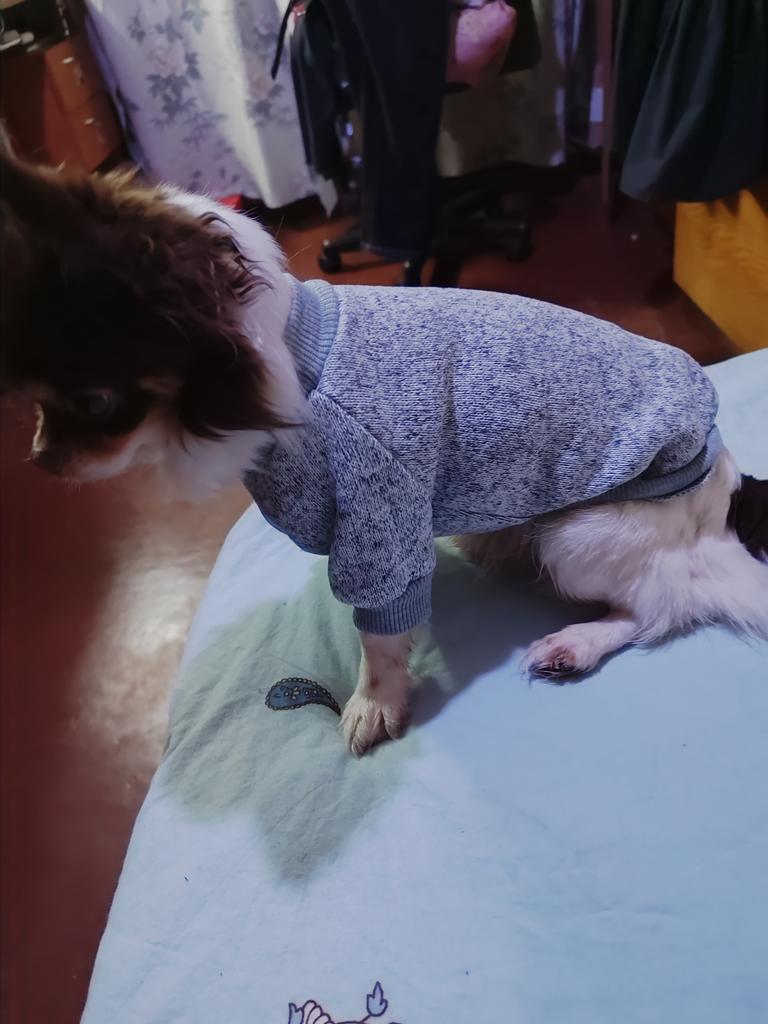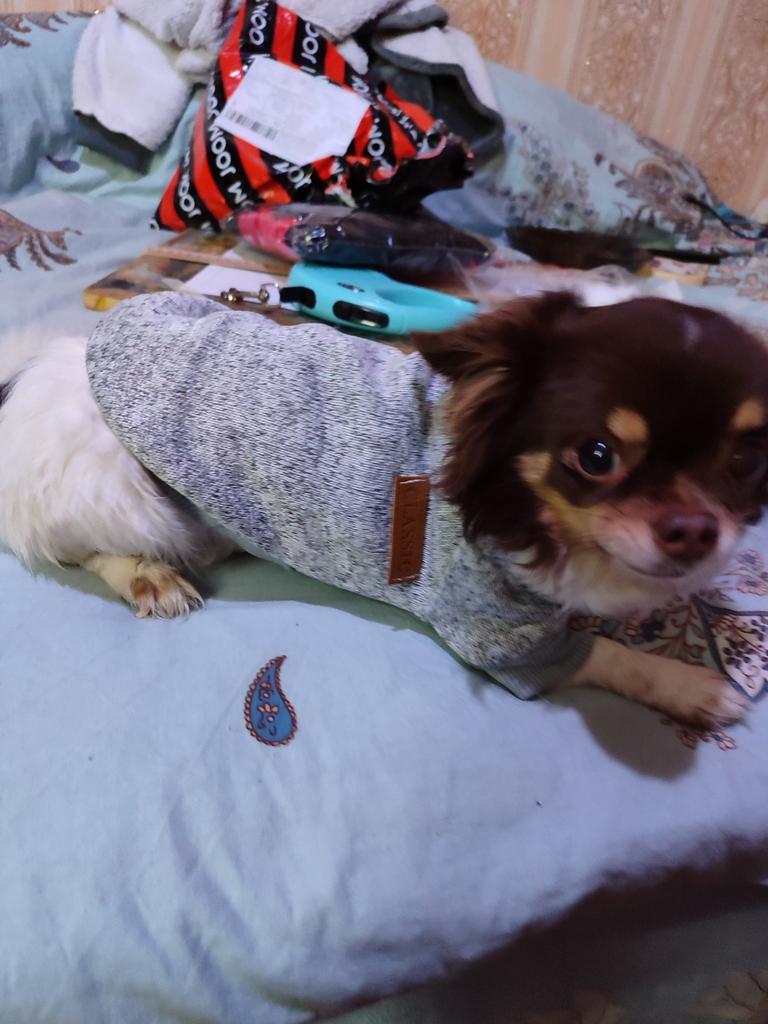 Ładny, miękki sweterek. Trochę za duży na 2kg Yorkie. Kupujemy już drugi. Po praniu kolor i rozmiar nie uległy zmianie.
