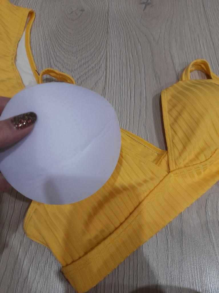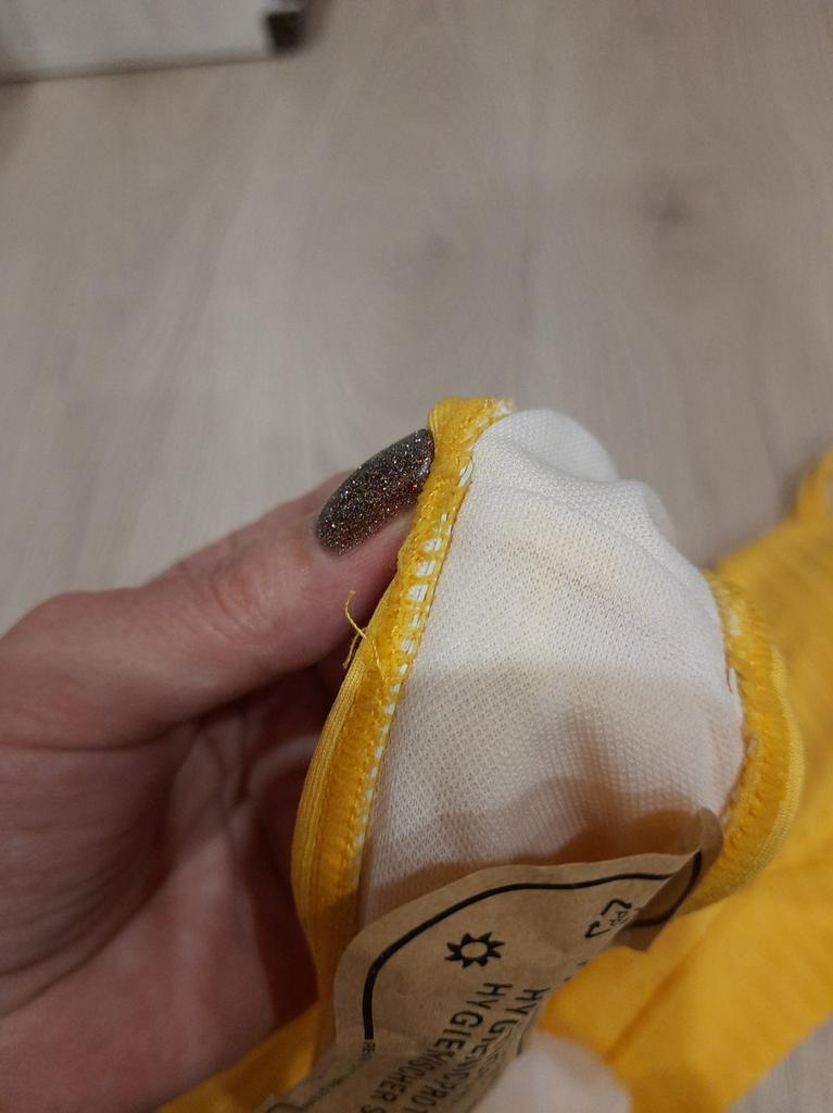 Jest za duży. Kolor nie jest tak jaskrawy jak na zdjęciu. Na jednym kubku jest zagięcie. Wygląda tanio. Jakość materiału i szycia jest słaba. Szycie jest krzywe, a nitki wystają. I nawet przyszyli jakiś czarny sznurek. Zwróciliśmy 50% kosztów.