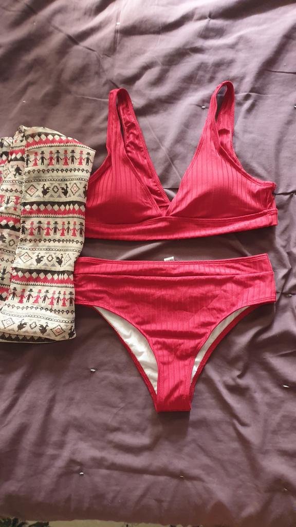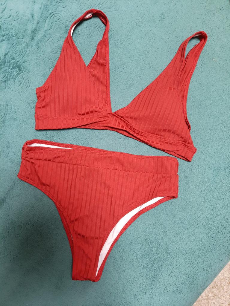 Kostium kąpielowy dotarł po prawie miesiącu, niestety jestem zawiedziony, że nie ma większego rozmiaru, noszę L i zamówiłem L tylko dlatego, że jest trochę mały w okolicy biustu, majtki są zgodne z rozmiarem, ale stanik powinien mieć byłby trochę większy, byłby idealny, garnitur jest ładny, ale jest dla mnie za mały, materiał jest rozciągliwy i trochę się kręci, nie podobało mi się to, a cena jest nieco wysoka jak na jego jakość