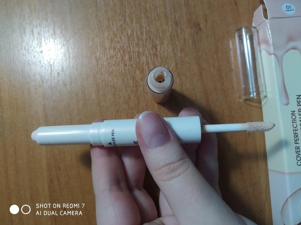 Dobry wieczór. Recenzuję podwójny korektor. Z jednej strony występuje w postaci ołówka, z drugiej strony w formie płynnej. Dostawa zajęła dość dużo czasu. Sam w sobie nie ma obcego zapachu. Konsystencja jest lekka, ale nie gęsta. Dlatego malowanie siniaków nie będzie działać. Będę aplikować jako bazę pod cienie. Postanowiłem spróbować czegoś nowego. Ale na zdjęciu kolor jest trochę jaśniejszy. Pudełko nienaruszone, nie zniszczone w transporcie. Dzięki Jum i sprzedawcy!!!