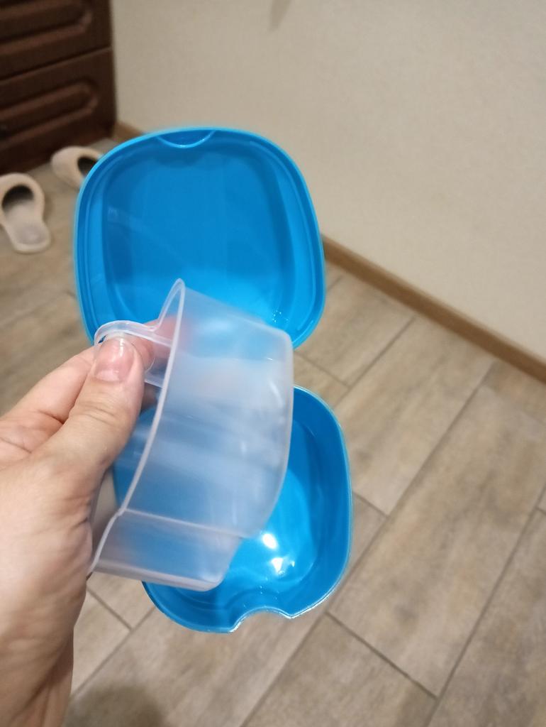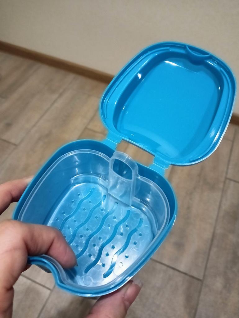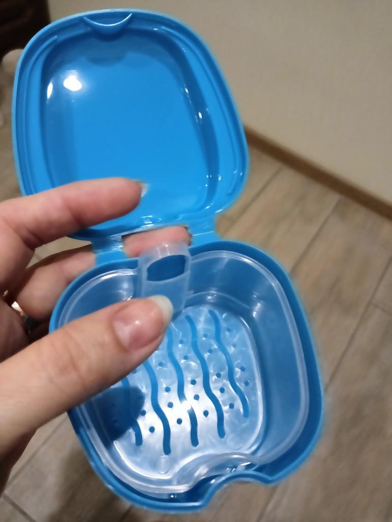 Pojemnik na ochraniacze na zęby. Możesz zbierać wodę, jeśli zdejmiesz ochraniacz na zęby na noc. Nadaje się również do protez zębowych. Wszystko jest jak na zdjęciu, dość masywne.