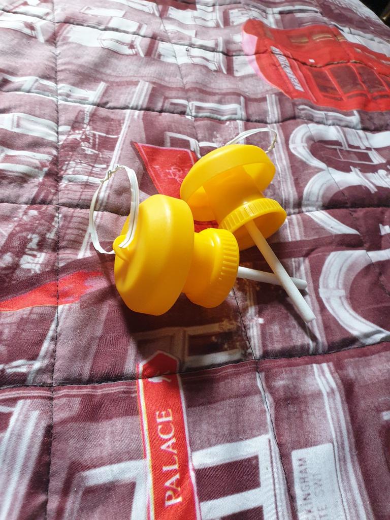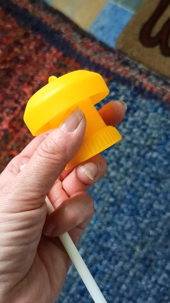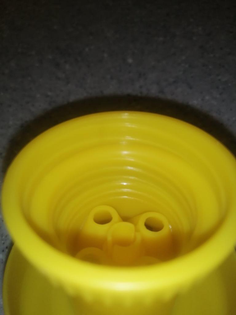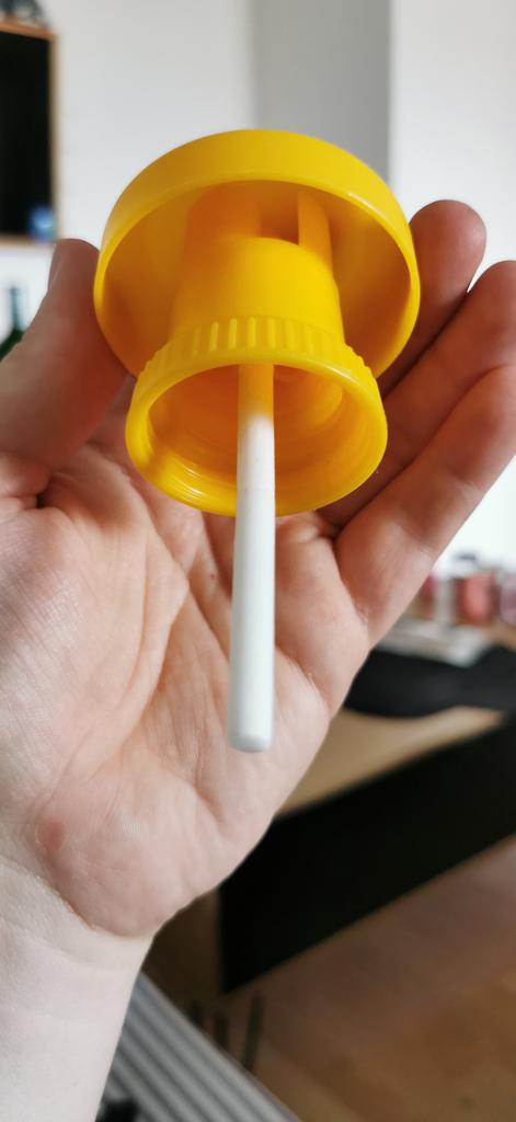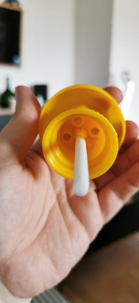 Jest zdeformowany z powodu złego opakowania, ale można go naprawić, podgrzewając go w czajniku. Nie pasuje do wszystkich normalnych butelek, ale pasują plastikowe butelki Granini.