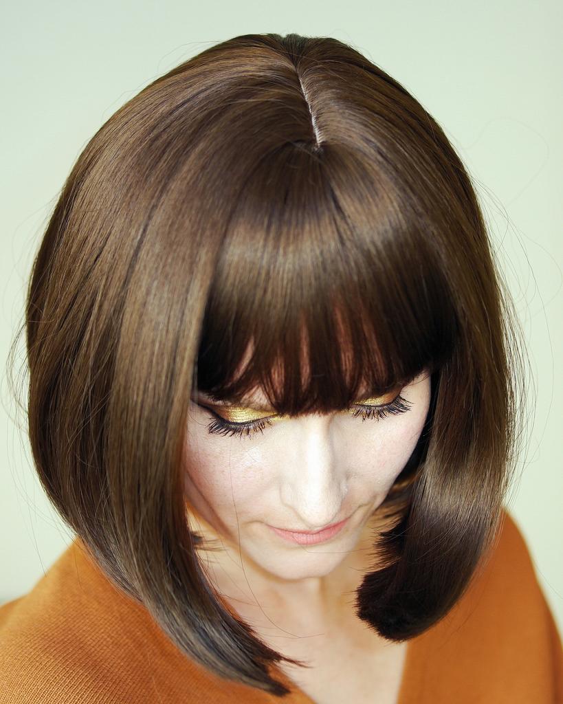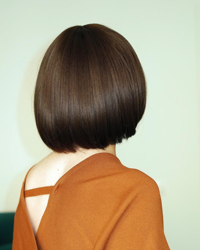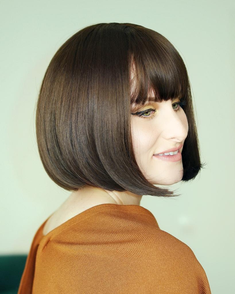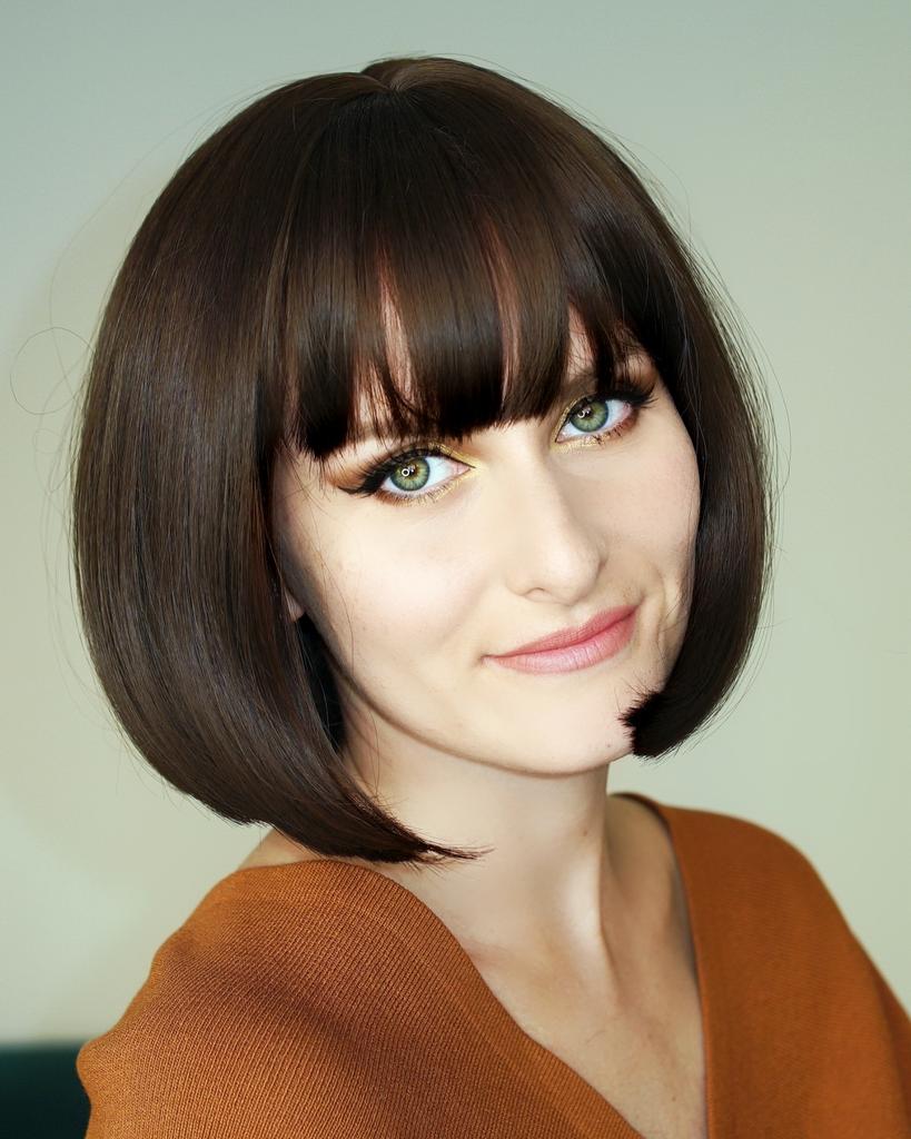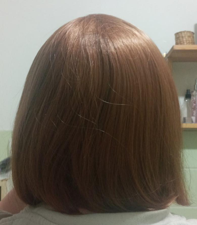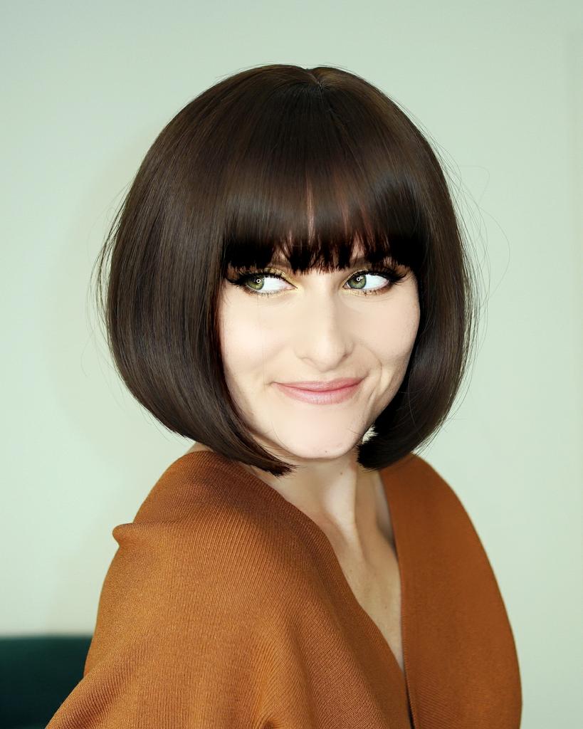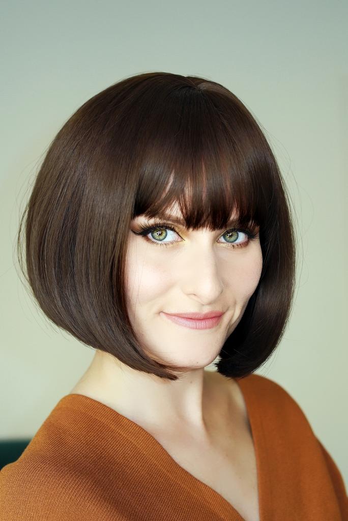 Kolor nie pasuje, nie krótki bob, tylko długi bob do ramion.Grzywka musiała być przycięta na długość nosa.Podstawa jest ogromna na całą szyję i do połowy uszu, dla duża głowa.