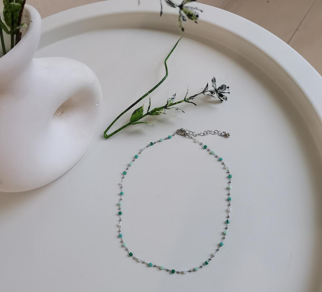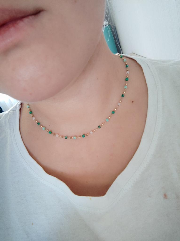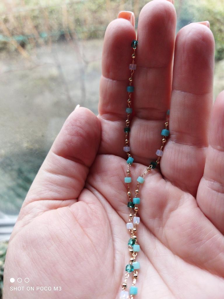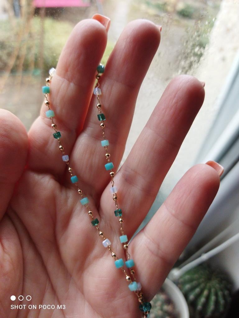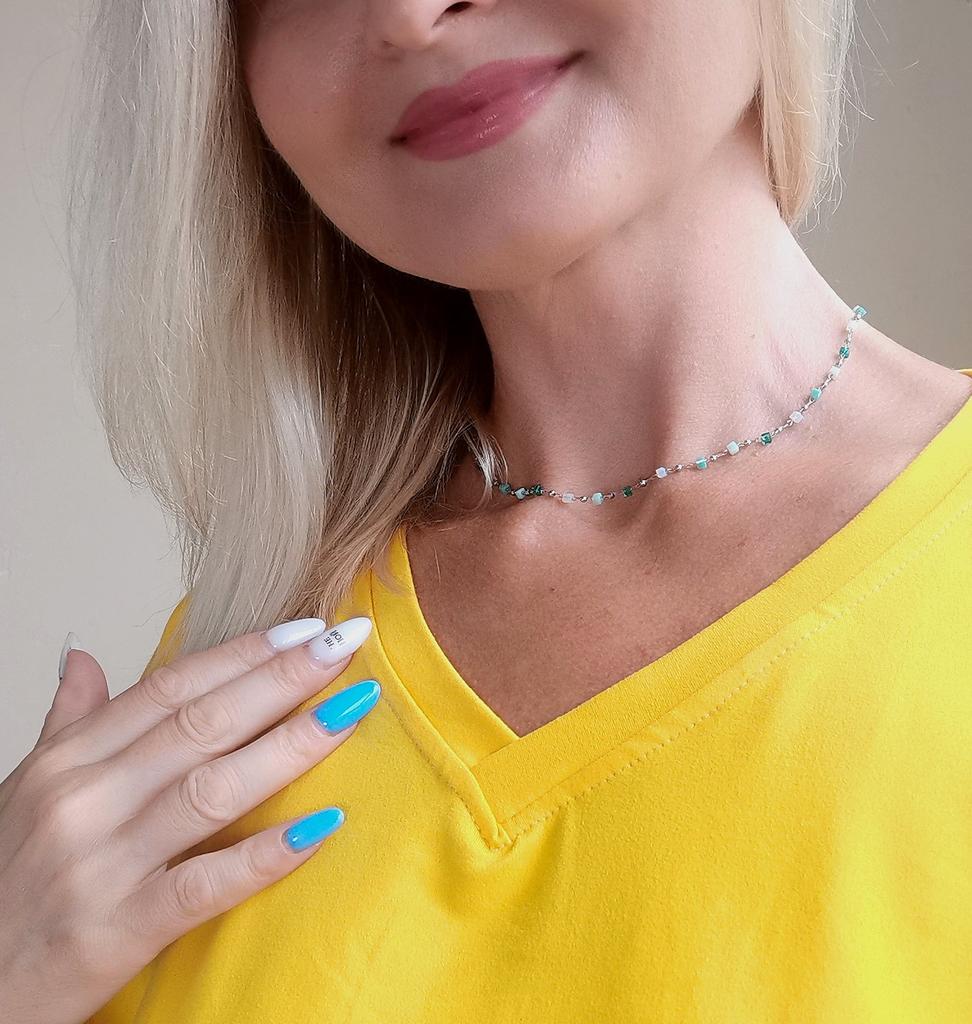 Bardzo delikatny, kobiecy i super modny naszyjnik wykonany z pięknie kolorowych koralików. Ale na bardzo cienką szyję.