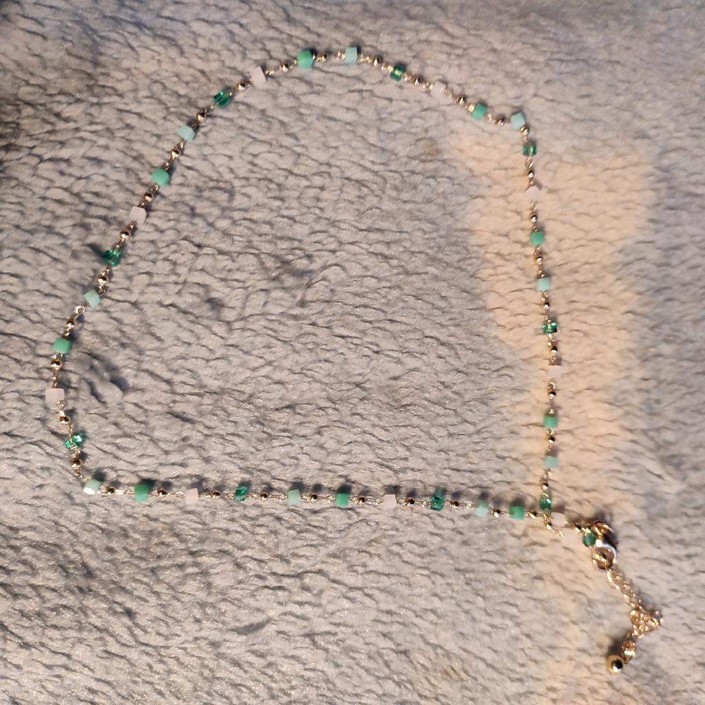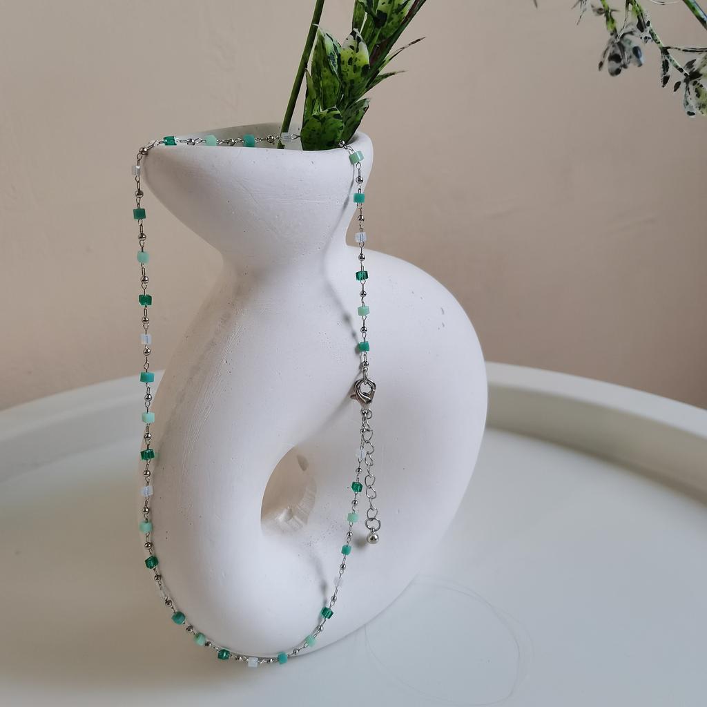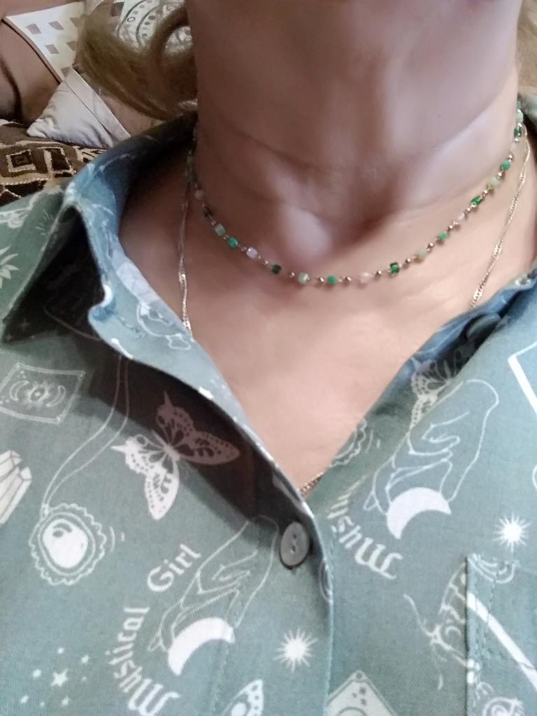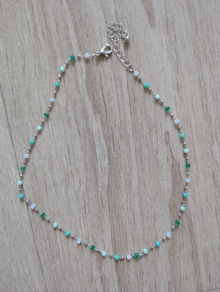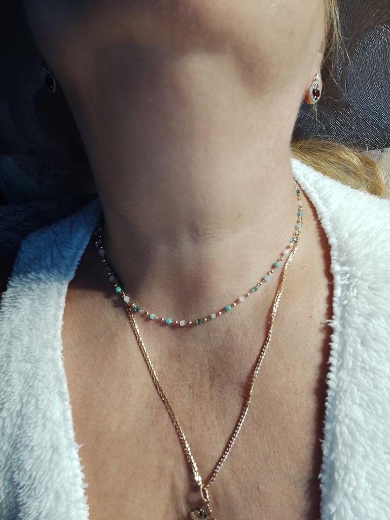 Bardzo delikatny, kobiecy i super modny naszyjnik wykonany z pięknie kolorowych koralików. Ale na bardzo cienką szyję.