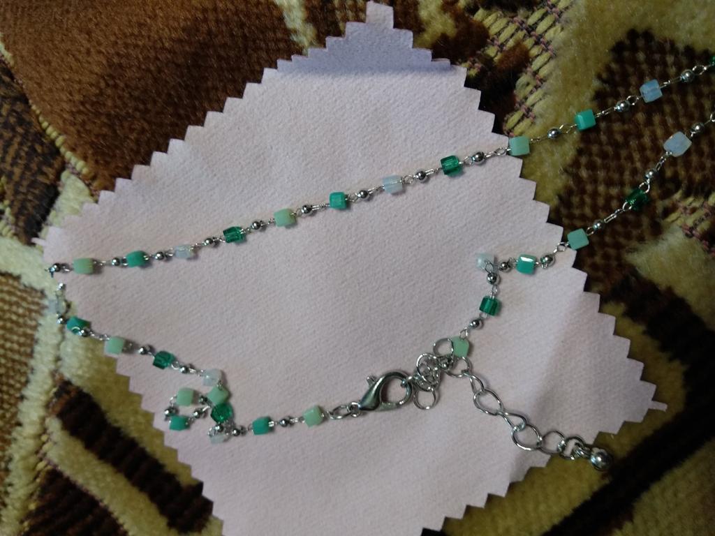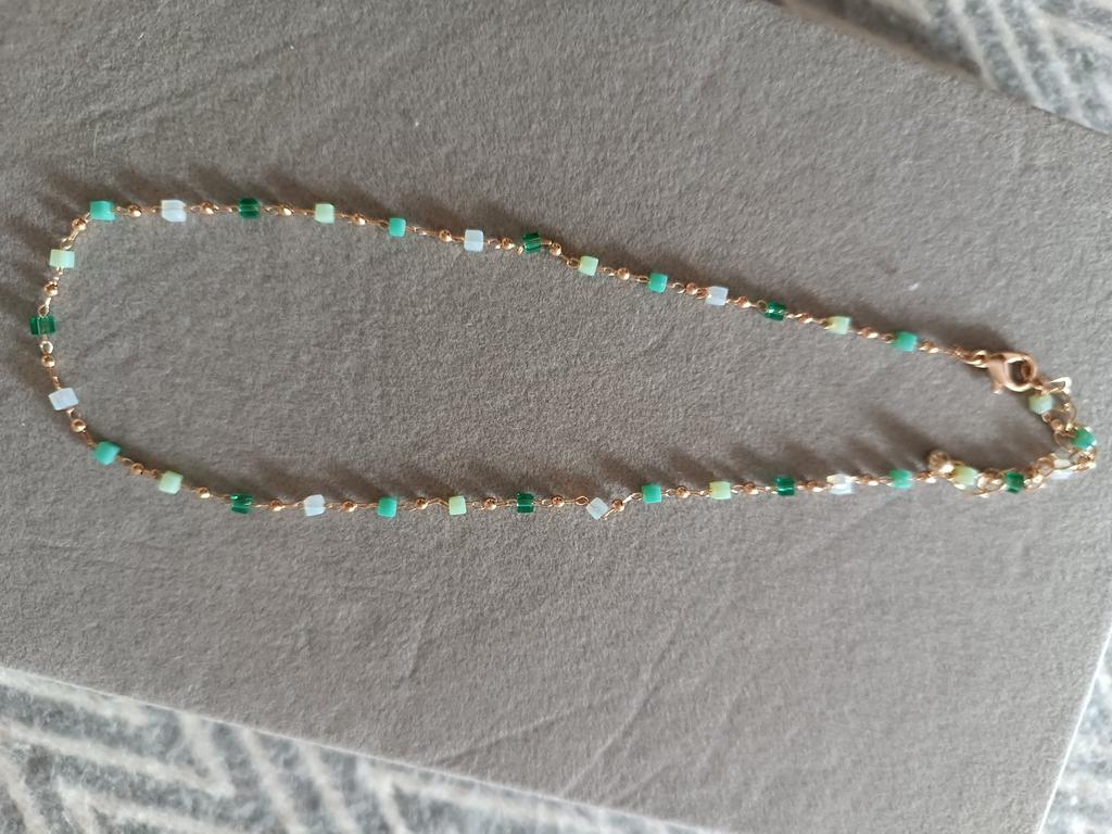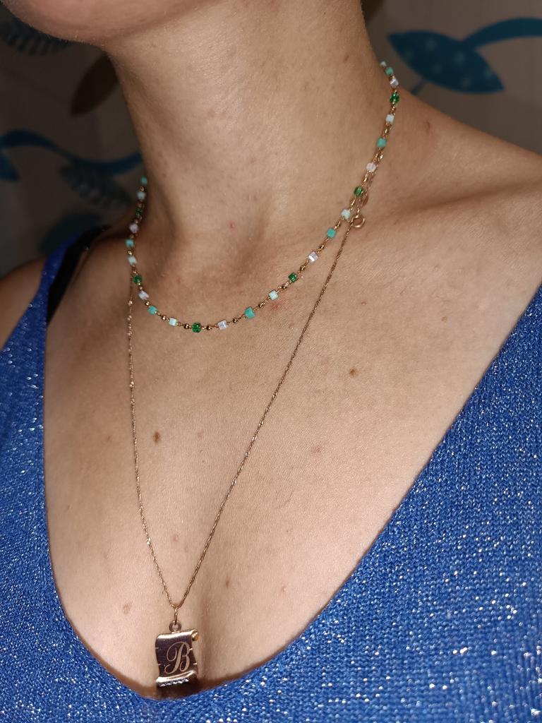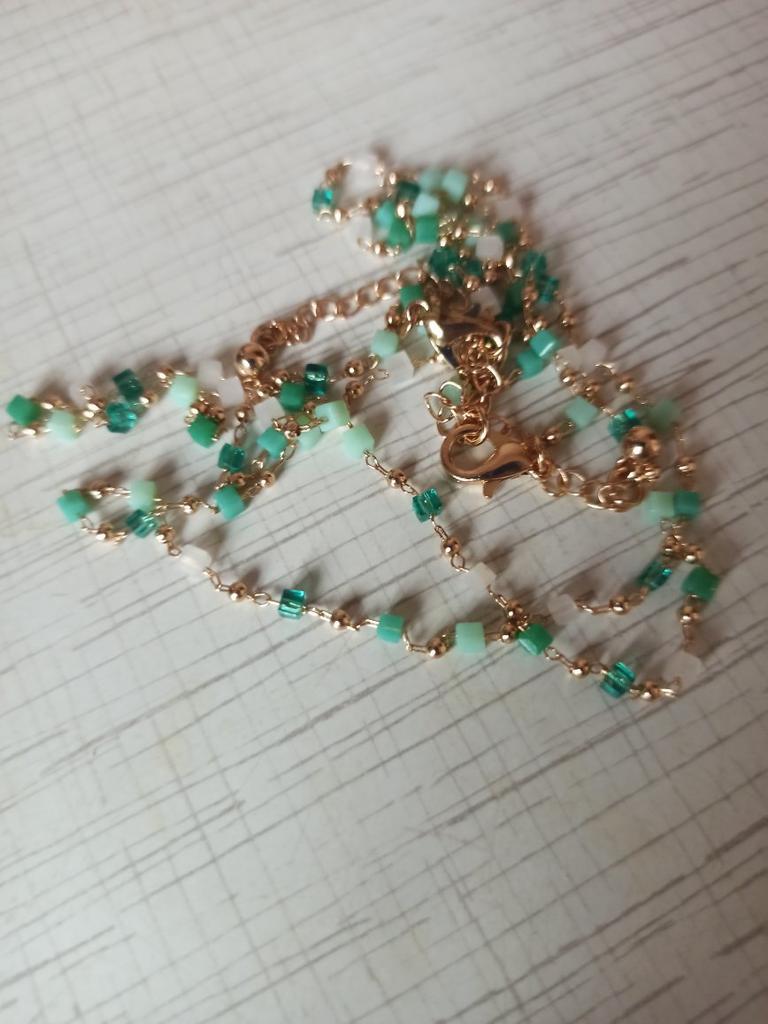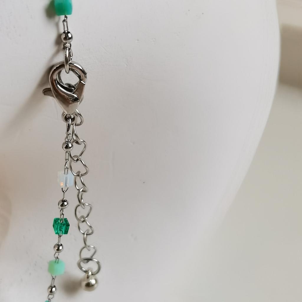 Bardzo delikatny, kobiecy i super modny naszyjnik wykonany z pięknie kolorowych koralików. Ale na bardzo cienką szyję.