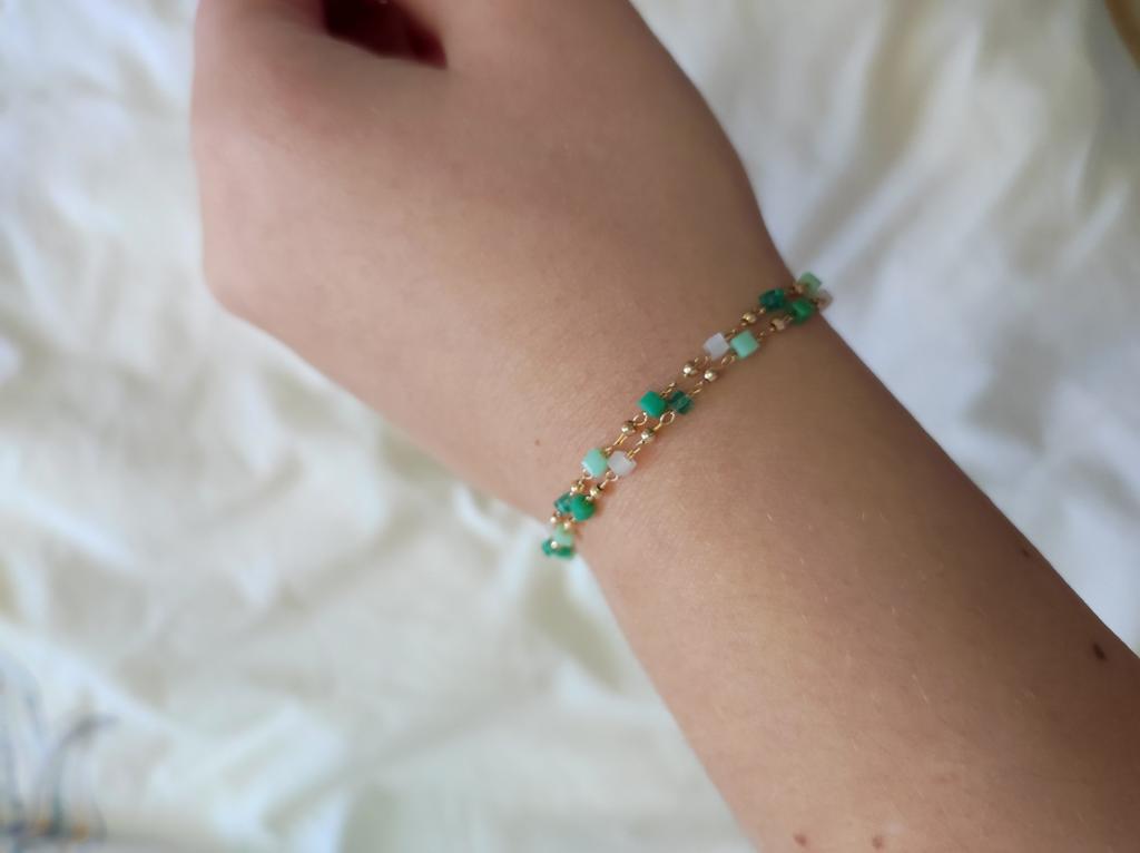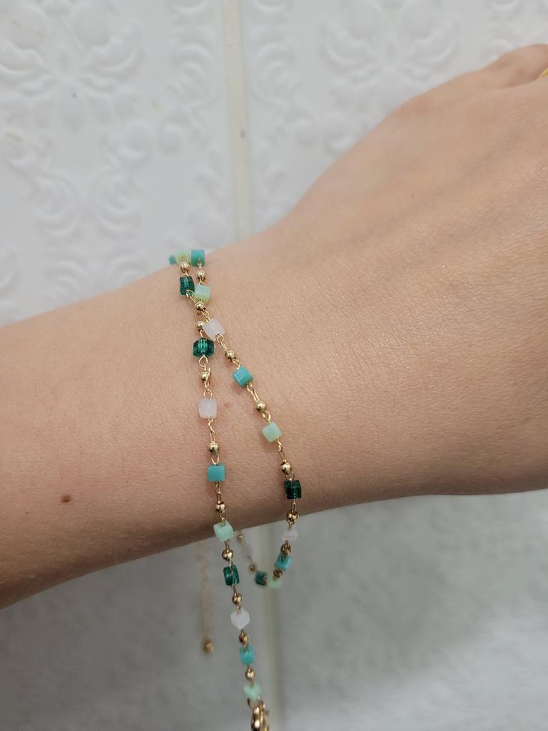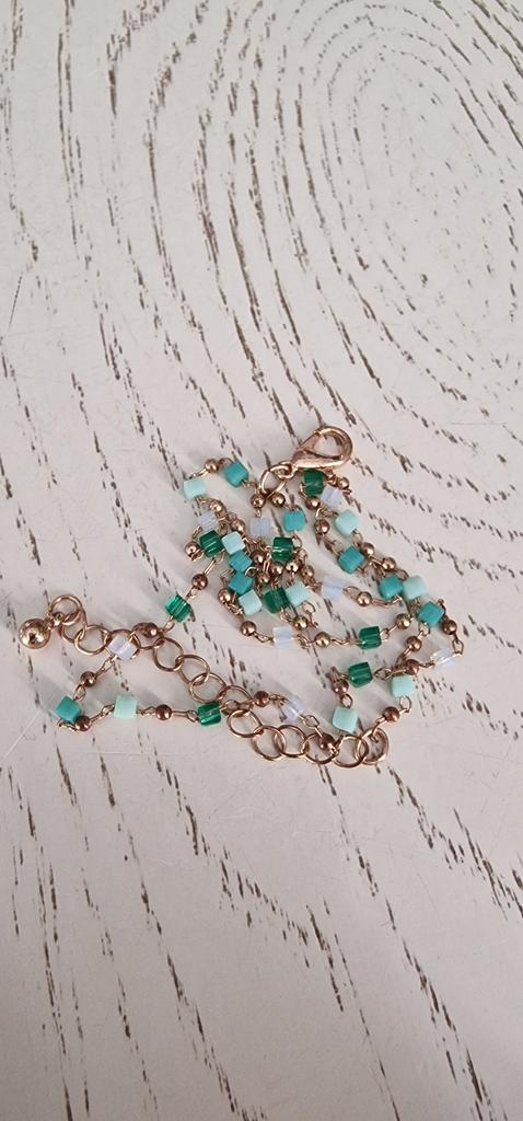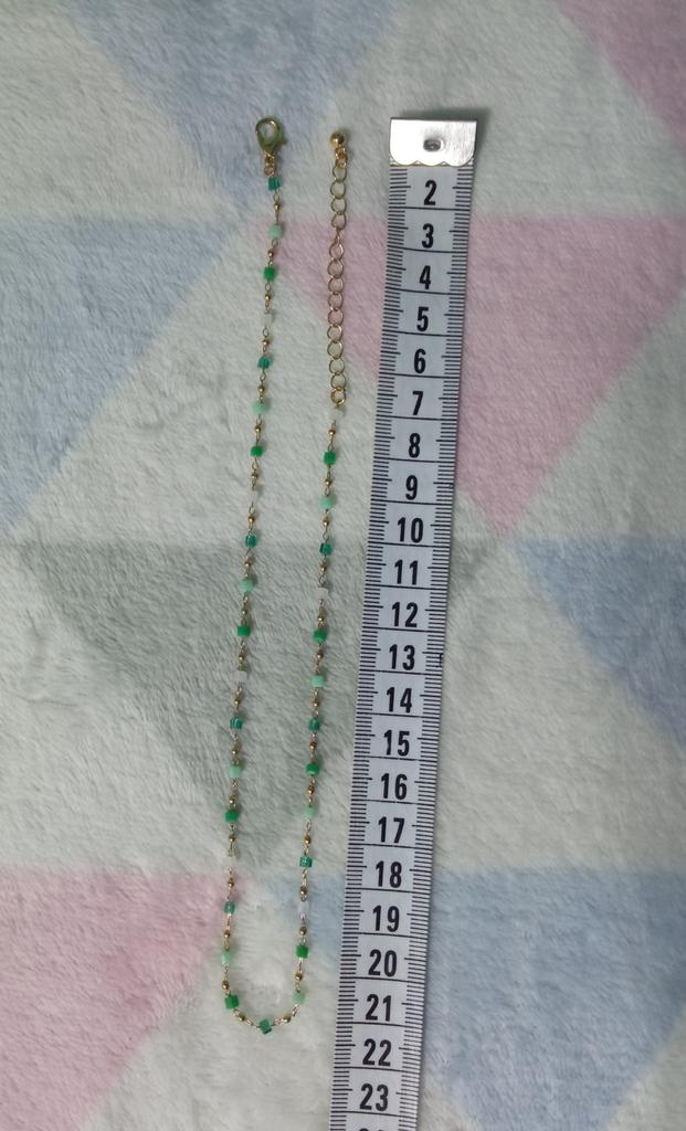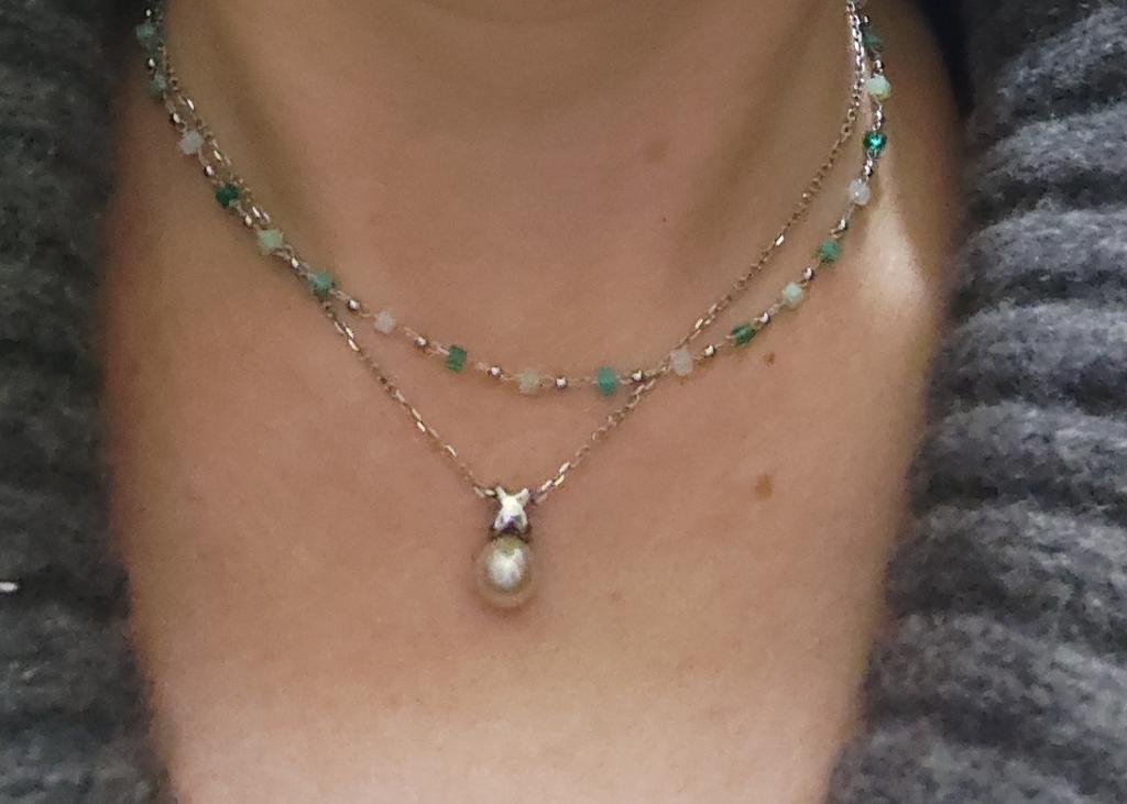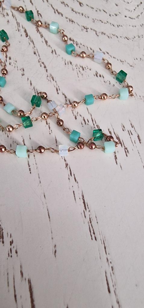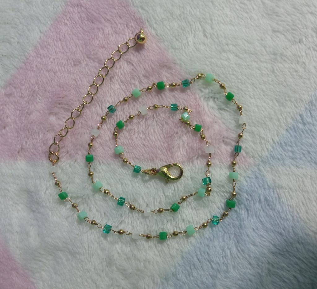 Kolejny sznur koralików, ale tutaj połączony ze złotym metalem. Wygląda uroczo, delikatnie skromnie i ładnie.