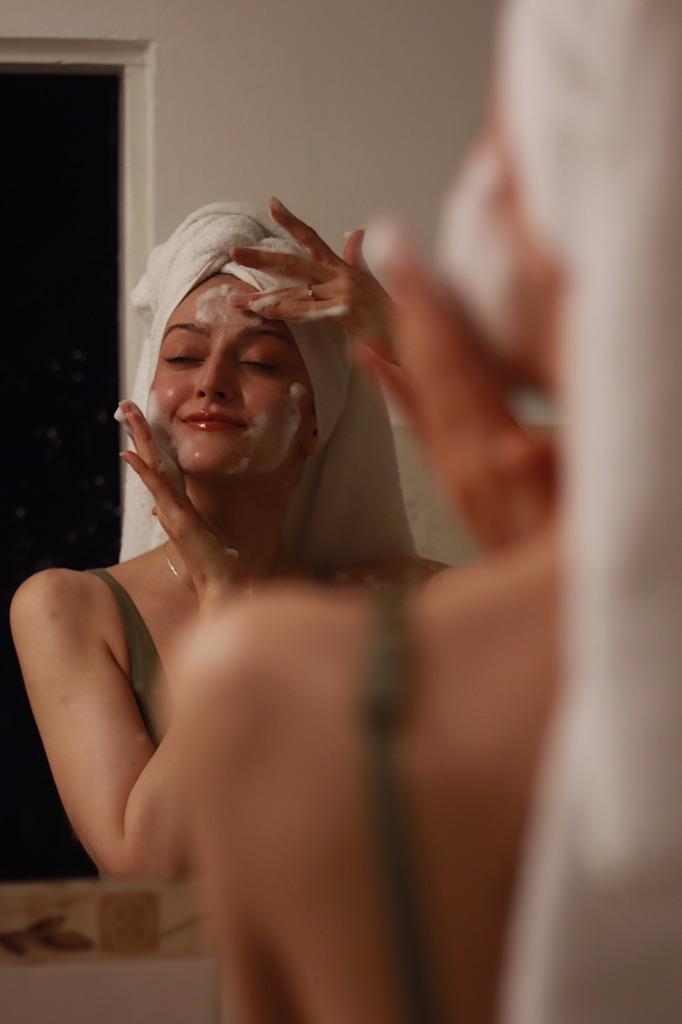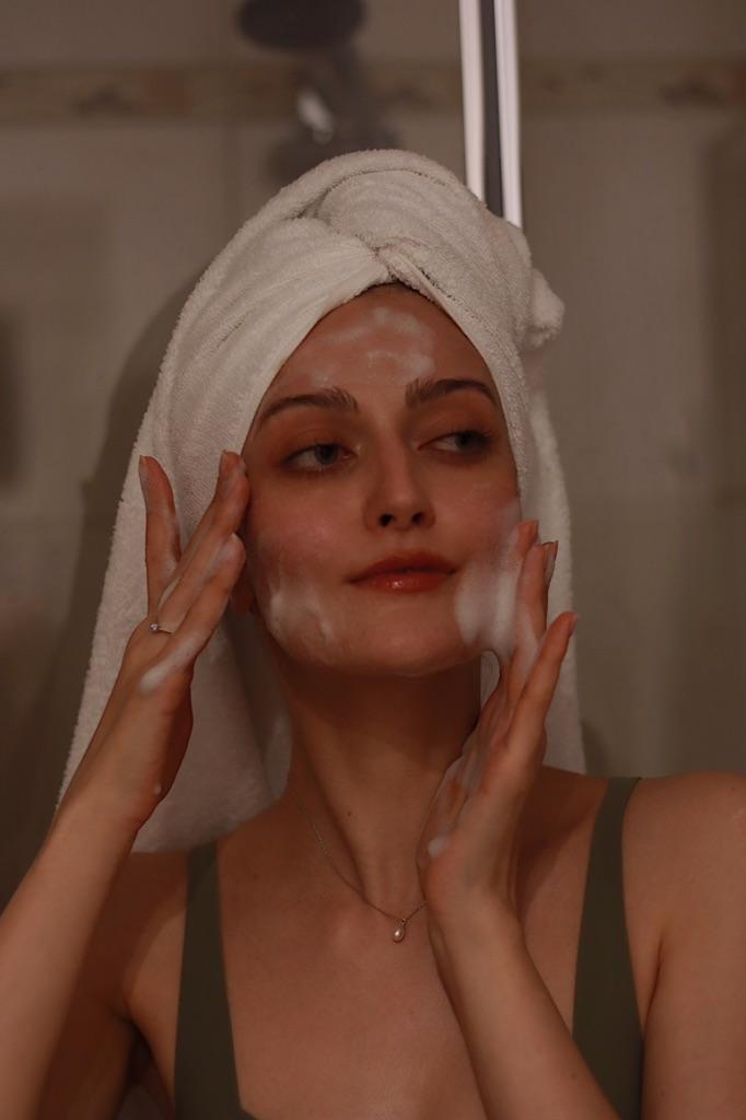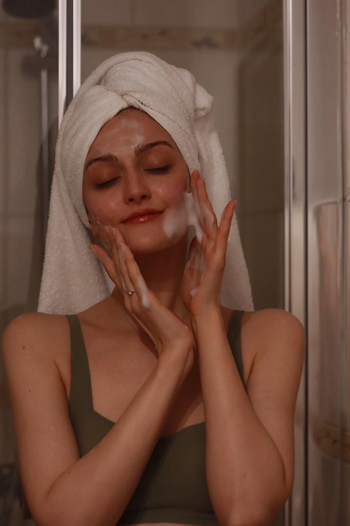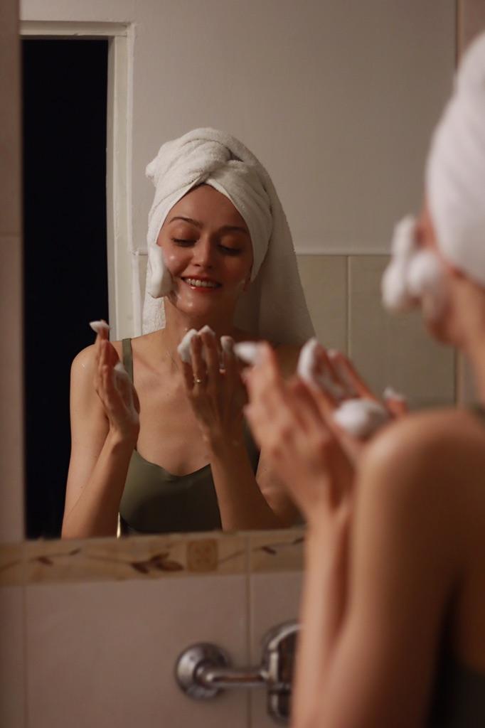 Na suche dłonie i twarz wmasuj odpowiednią ilość pianki w dłonie, aby całkowicie nałożyć na twarz. Następnie delikatnie wmasuj piankę w twarz, aż całkowicie zniknie.