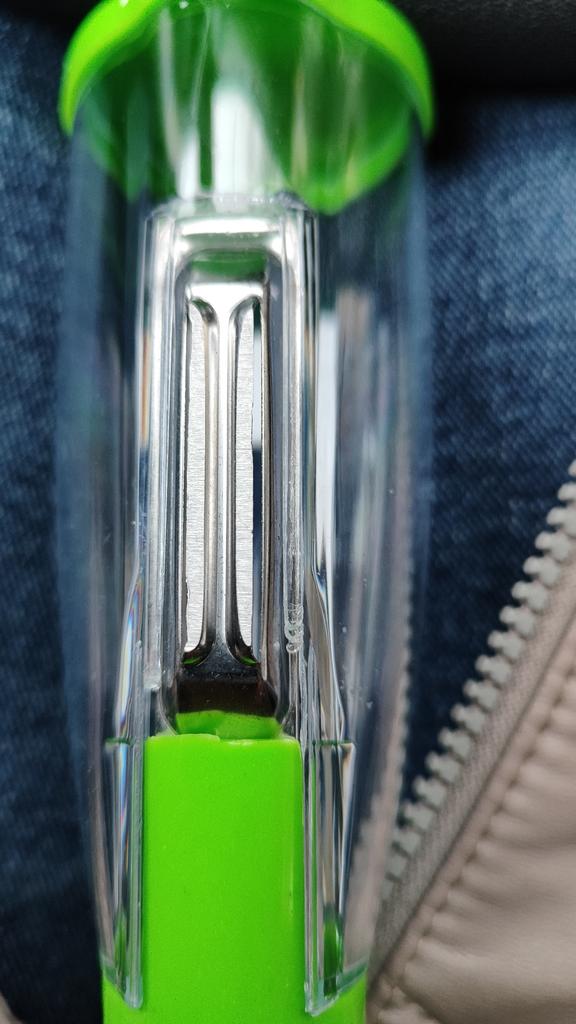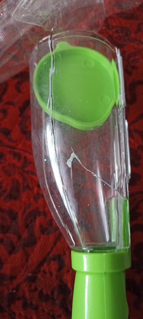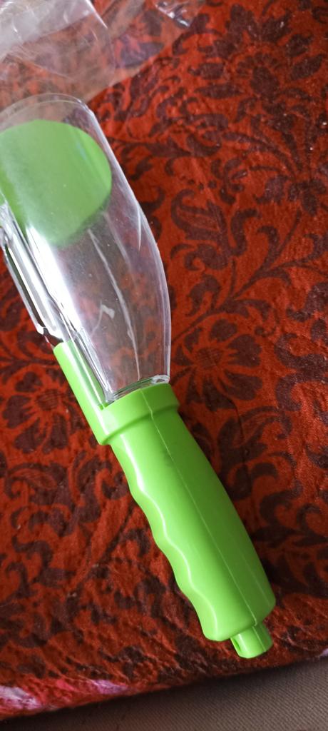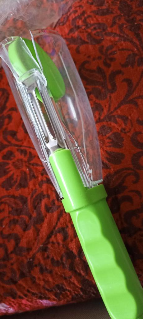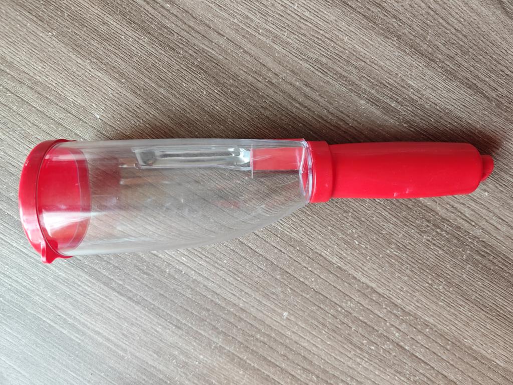 Pojemnik na odpady był niestety już pęknięty, plastik jest zbyt cienki. Mimo to wypróbuję obieraczkę, uważam, żeby plastik się nie rozszczepił..
