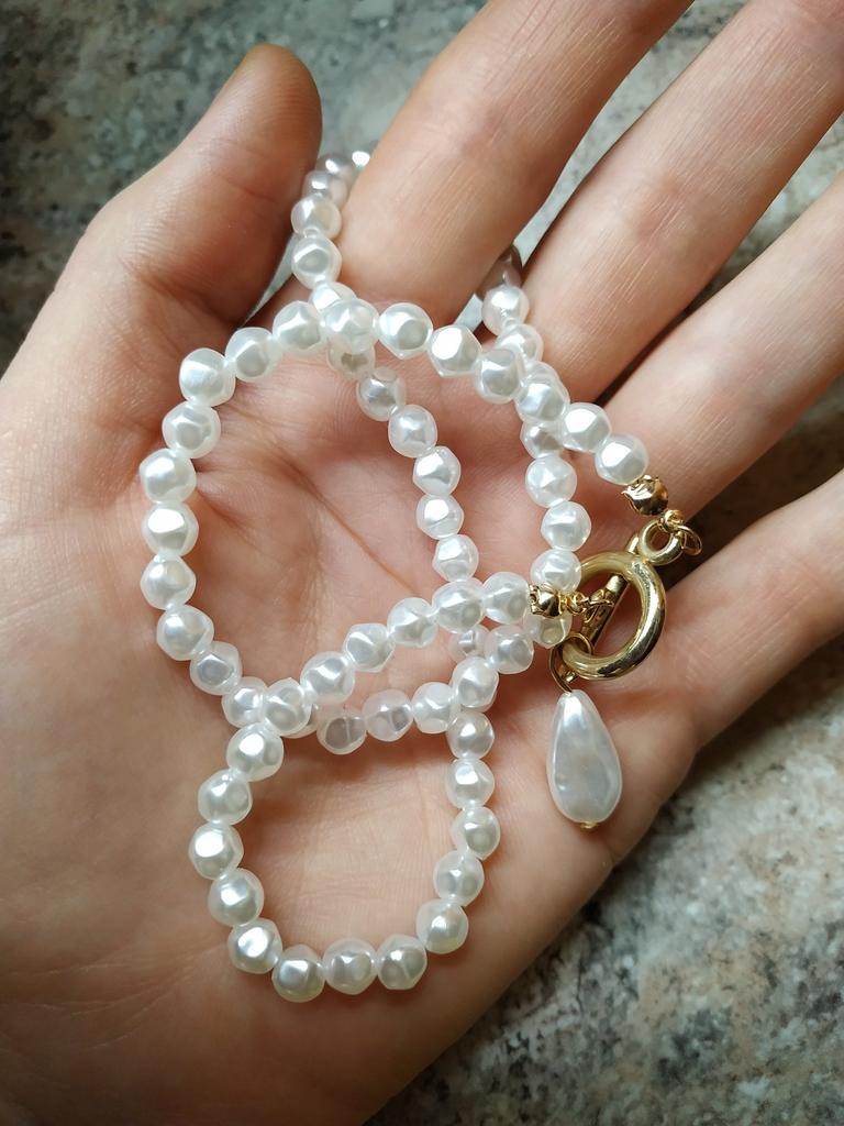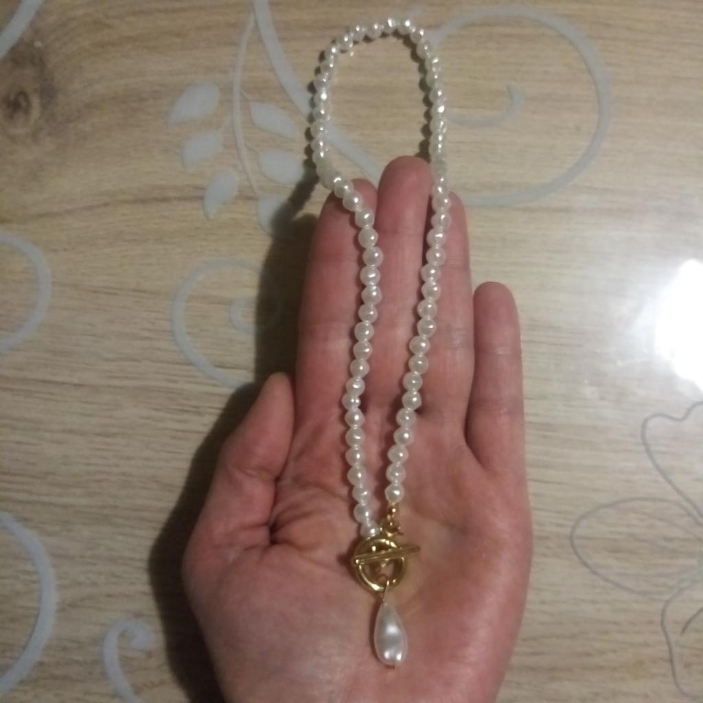 Perły są lekkie, wydaje mi się, że plastikowe, ale wyglądają naturalnie. Za taką cenę wysokie oczekiwania też nie mają sensu. Dziękuję