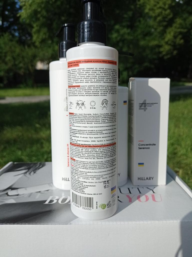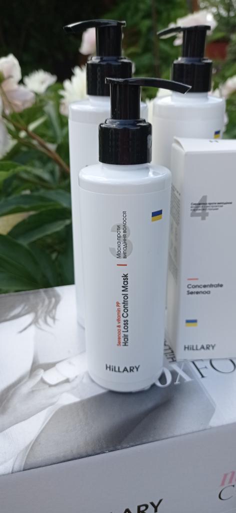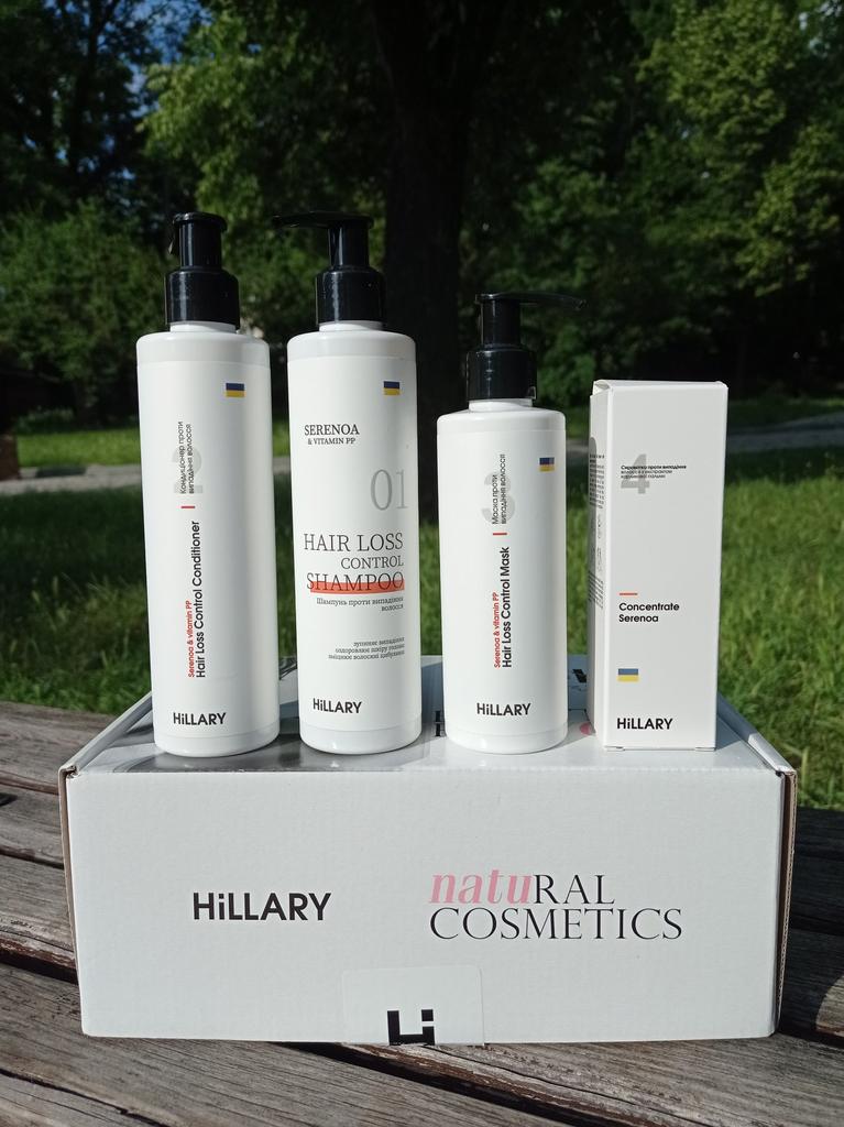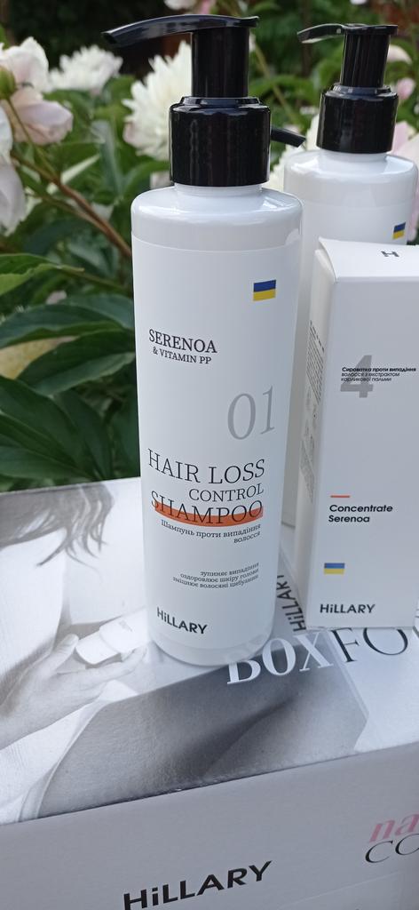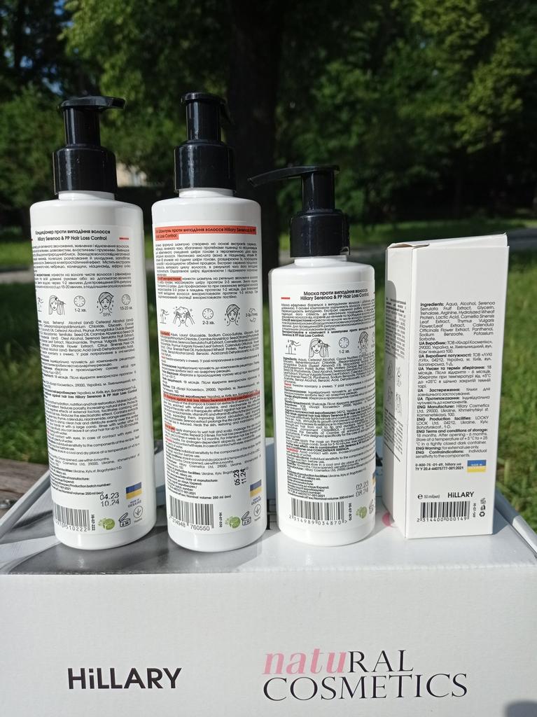 Zestaw zawiera: Hillary Serenoa & PP Hair Loss Control szampon przeciw wypadaniu włosów, 250 ml, Hillary Serenoa & PP Hair Loss Control odżywka przeciw wypadaniu włosów, 250 ml, Hillary Serenoa & PP Hair Loss Control maska przeciw wypadaniu włosów, 200 ml, Wysoko skoncentrowany kompleks do włosów z ekstraktem z palmy karłowatej Hillary CONСENTRATE SERENOA, 50 ml