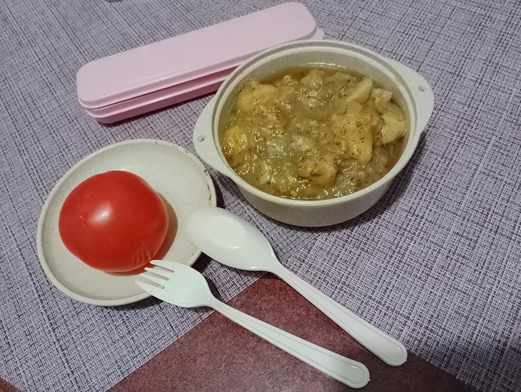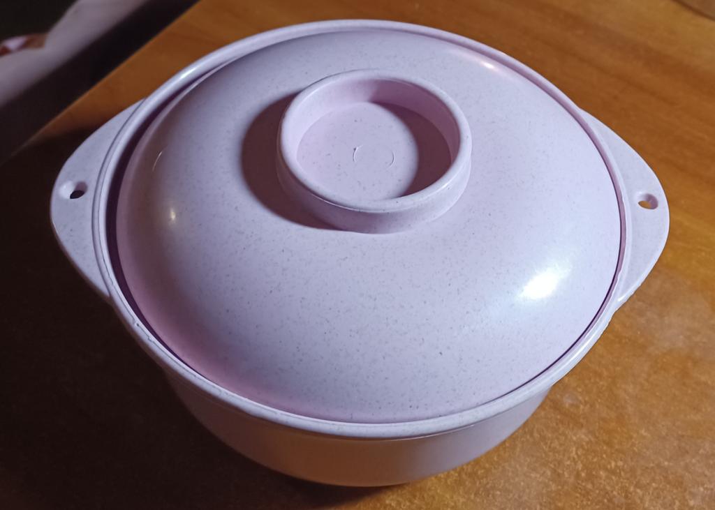 Pokrywka nie domyka się szczelnie, mam nadzieję, że wyprostuje się w trakcie użytkowania. Mały rondelek, maksymalnie 500 ml. Zabrałem to do pracy.