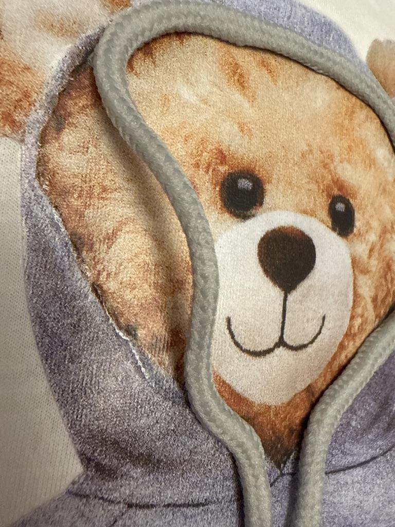 Jakość jest doskonała - bawełna jest gruba, miś jest naklejką, ale wygląda pięknie.