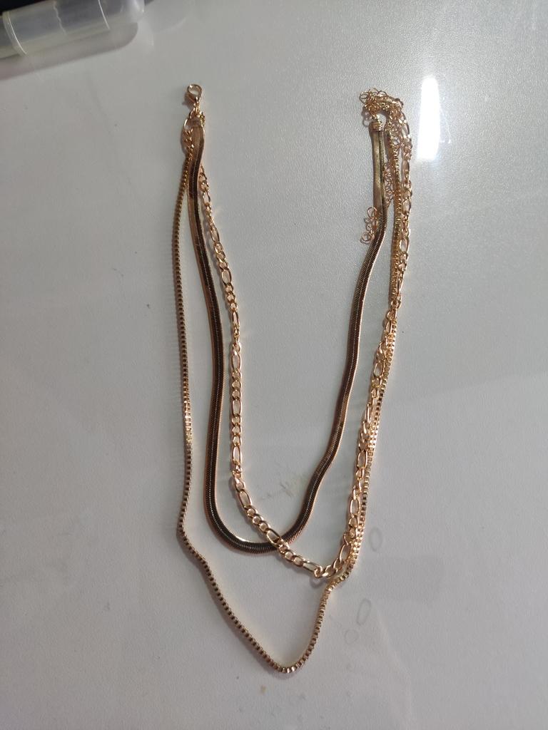 Potrójny łańcuszek jest w kolorze złotym i wygląda bardzo ładnie.