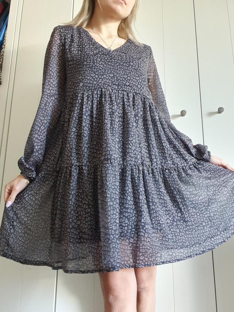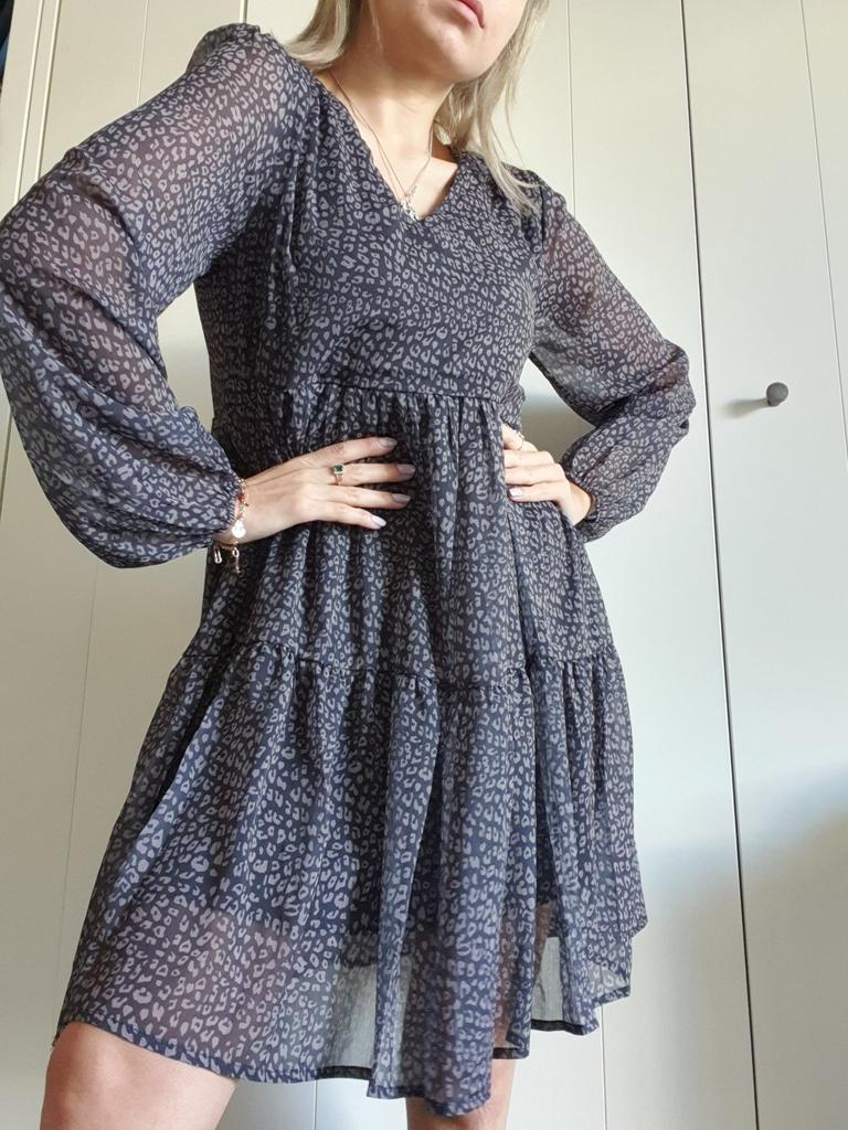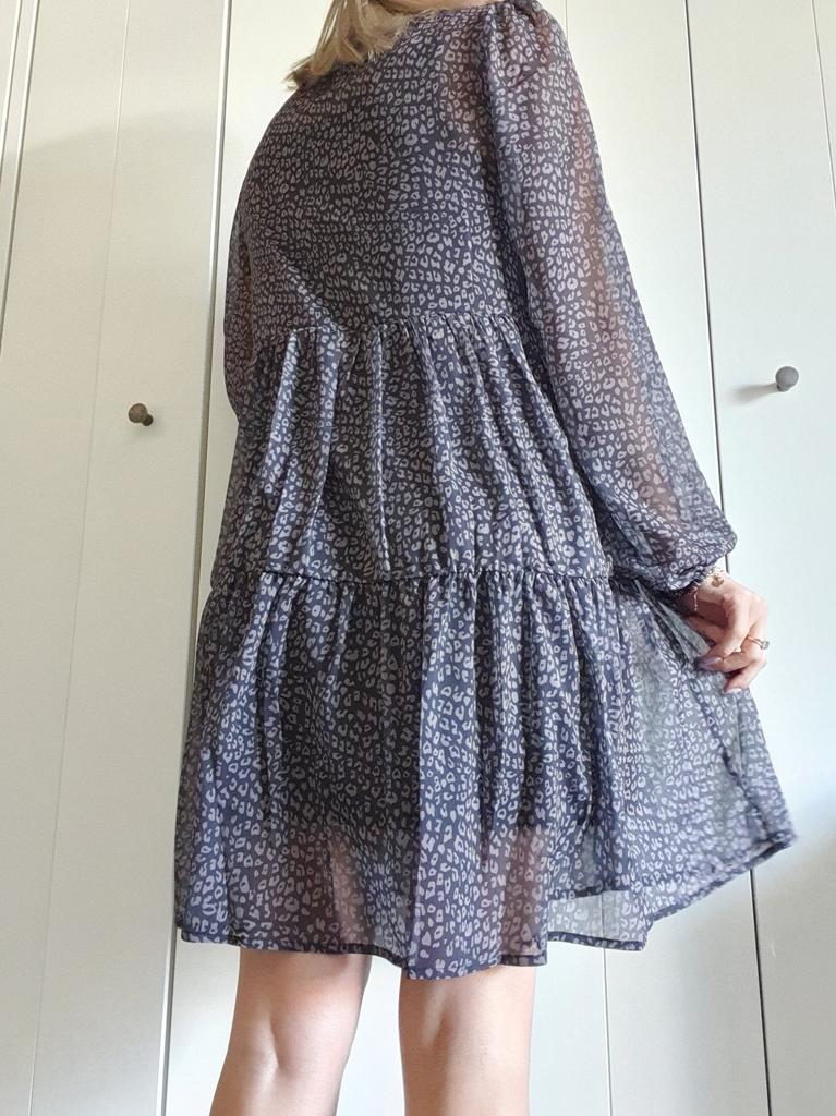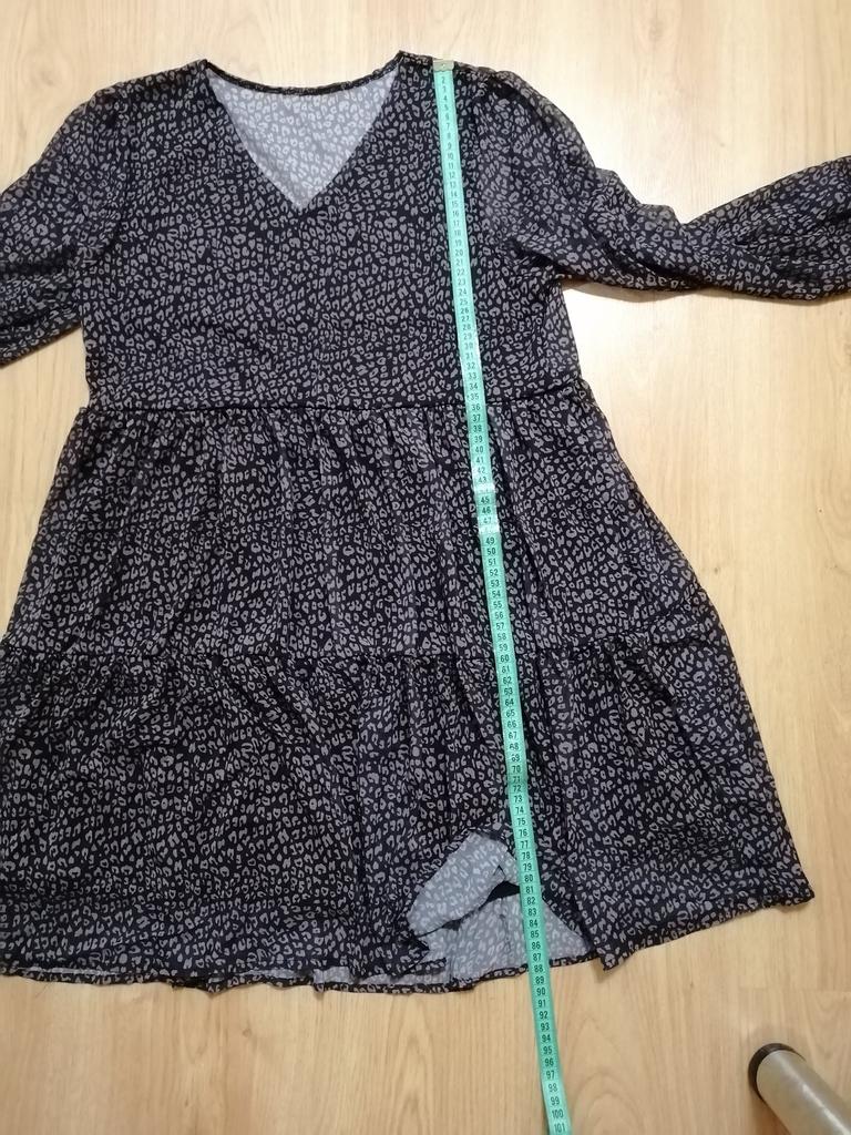 Piękna sukienka w stylu „boho”. Uwielbiam takie sukienki, jest trochę na luzie, ale jednocześnie bardzo stylowo. Jest oversize z wzorem w panterkę, dostępna w różnych rozmiarach. Zamówiłam xxl na 103/85 cm i pasuje idealnie. Sukienka jest przezroczysta, ale ma czarną podszewkę od wewnątrz, jak sukienka mini. Długie rękawy, dekolt w kształcie litery V, długość tuż nad kolano przy wzroście 168 cm. Świetna jakość i szybka dostawa. Udanych zakupów!