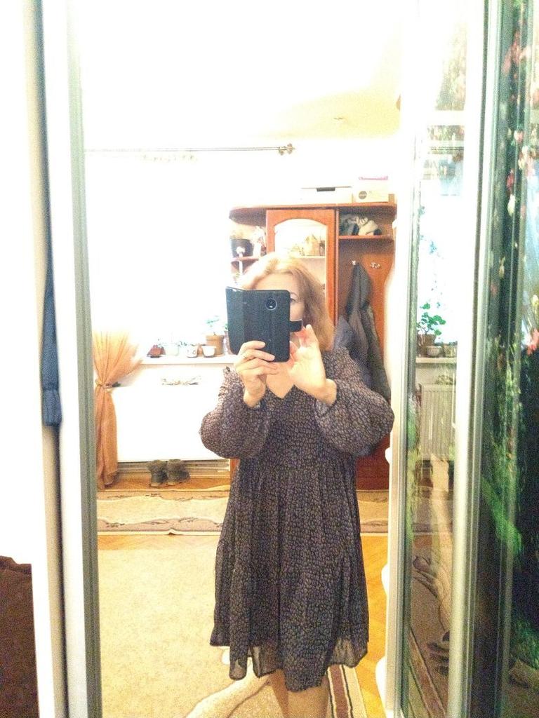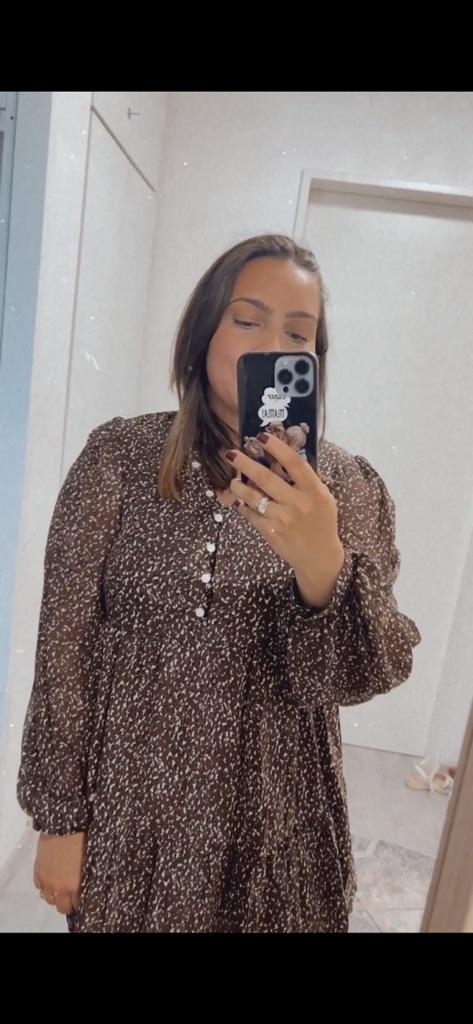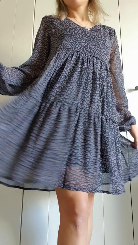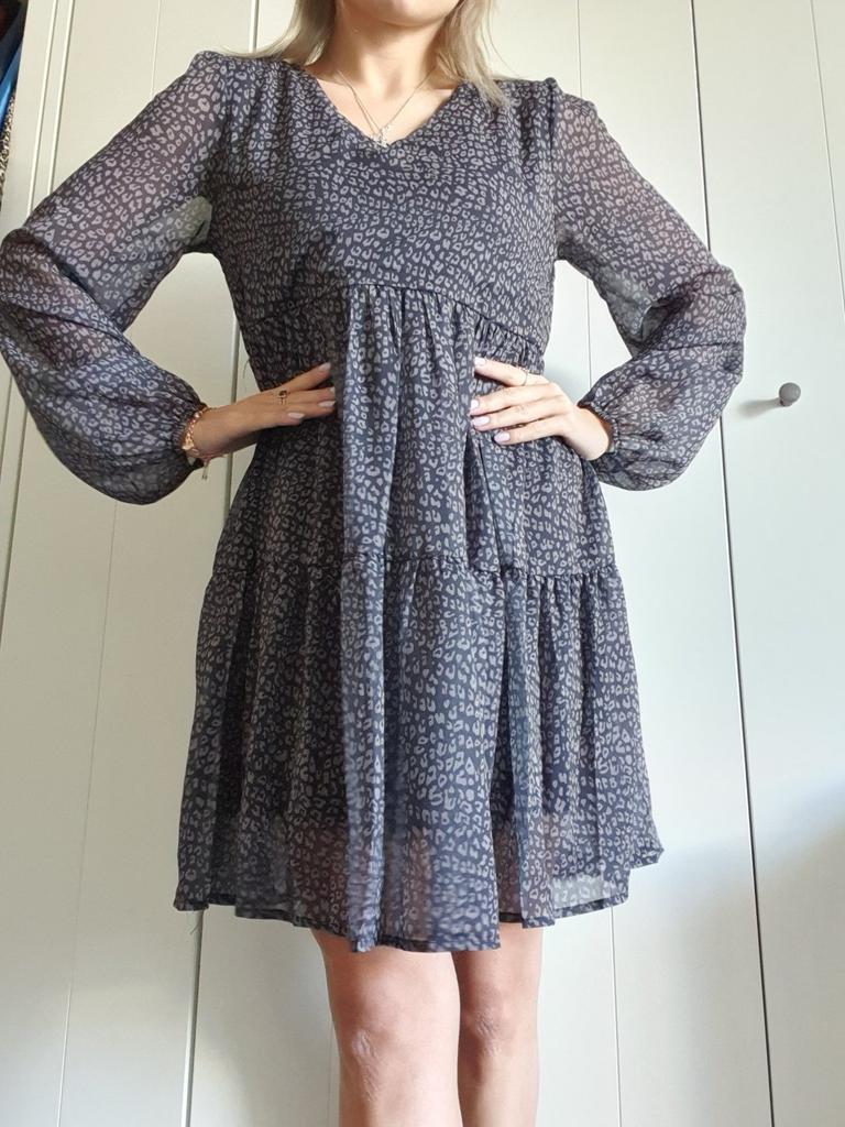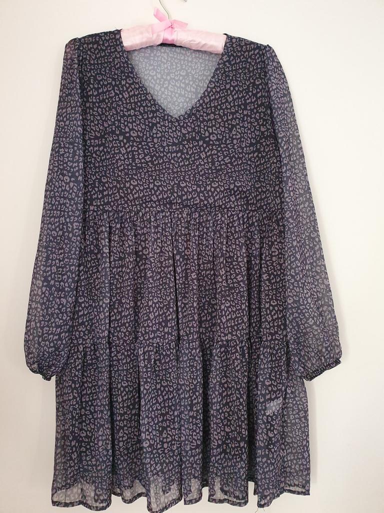 Piękna sukienka w stylu „boho”. Uwielbiam takie sukienki, jest trochę na luzie, ale jednocześnie bardzo stylowo. Jest oversize z wzorem w panterkę, dostępna w różnych rozmiarach. Zamówiłam xxl na 103/85 cm i pasuje idealnie. Sukienka jest przezroczysta, ale ma czarną podszewkę od wewnątrz, jak sukienka mini. Długie rękawy, dekolt w kształcie litery V, długość tuż nad kolano przy wzroście 168 cm. Świetna jakość i szybka dostawa. Udanych zakupów!