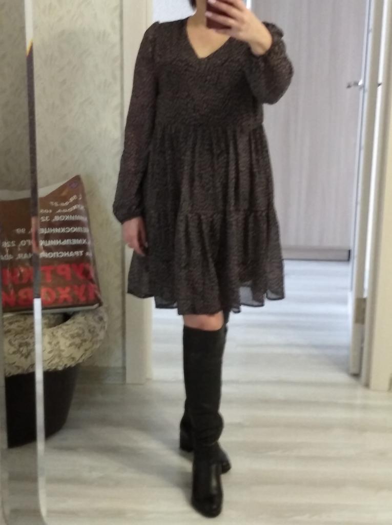 Dobry wieczór 🙂 Stylowa sukienka w tygrysi wzór 🐾 Materiał 35% bawełna + 65% poliester, jest lekki, przewiewny, przyjemny dla ciała i wygodny. Szycie jest dobre, było kilka nitek. Podszewka jest gęsta, czarna, nie prześwituje. Rękawy prążkowane, nie obcisłe. Rozmiar M pasuje mi idealnie, sukienka jest luźna - fason przypomina dzwonek. Moje parametry to wzrost 157 cm, waga 49 kg, 91/67/90. Większa osoba również wejdzie. Świetnie wygląda w połączeniu ze skórzaną lub jeansową kurtką. A mi bardziej podoba się wersja z paskiem. Szybka dostawa, tylko 3 tygodnie. Jestem zadowolony z zakupu i polecam.