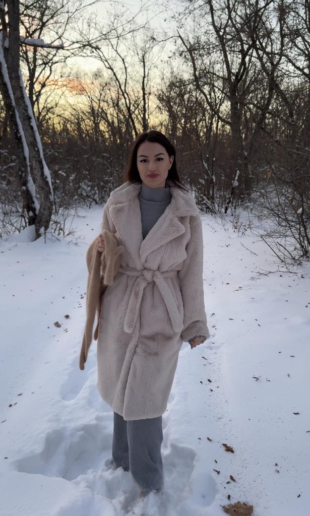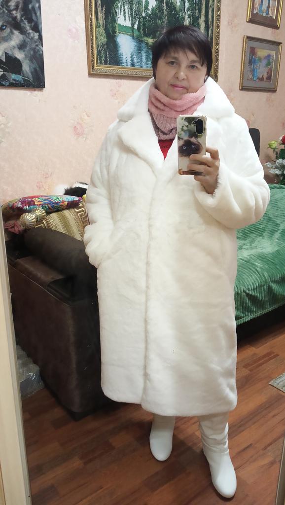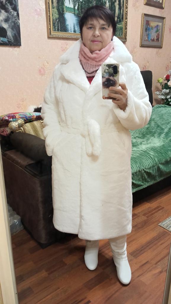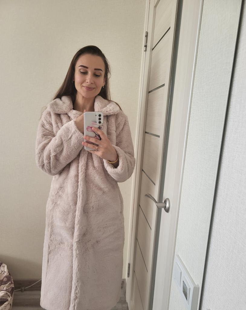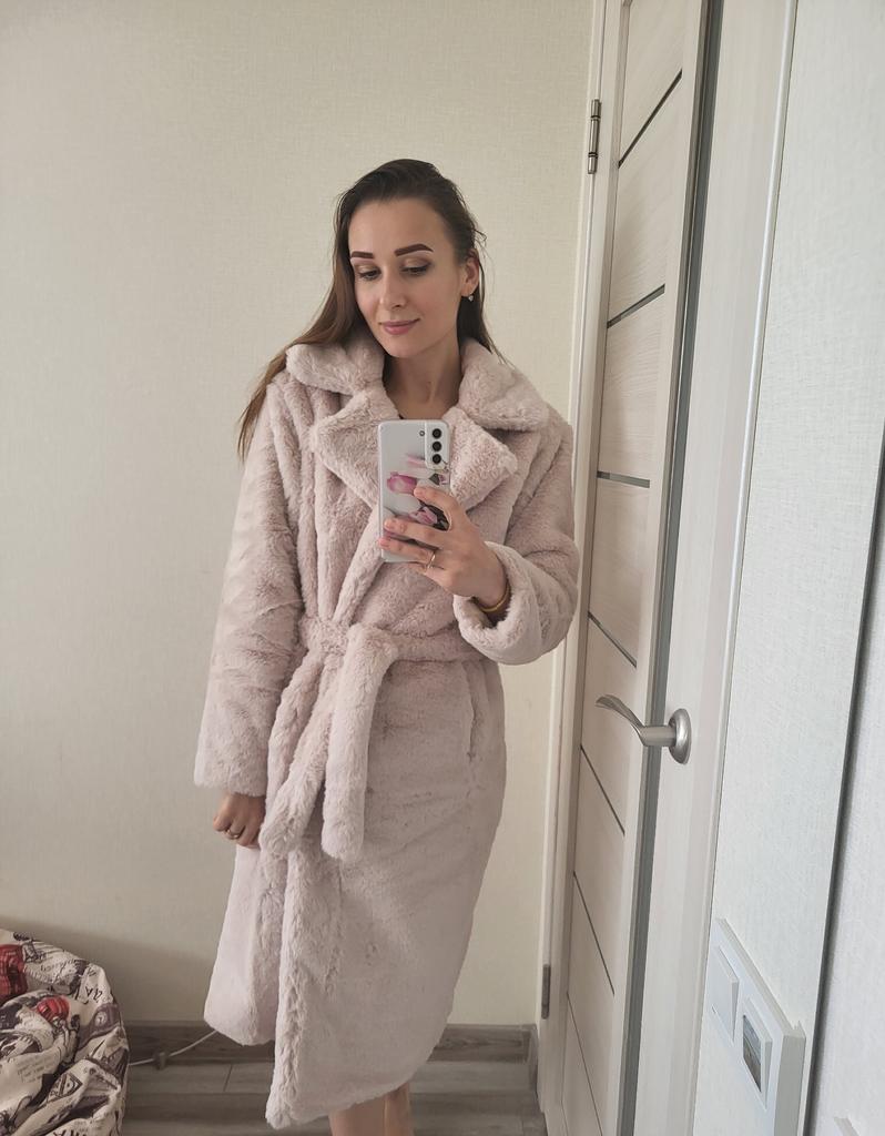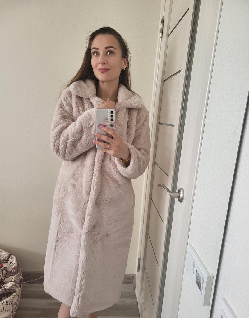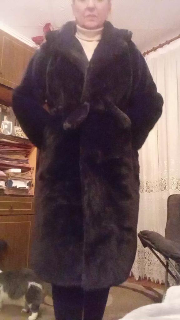 Płaszcz jest świetny. Miękkie światło. Jakość szycia, nawet nitki nigdzie nie wystają. Zapinany na duże guziki. Dobrze wygląda z paskiem lub bez. Zgodnie z objętością klatki piersiowej i długością produktu odpowiada dokładnie koszulce. Długość rękawa z ramieniem 72 cm Kolor jest nasycony, ale nie „wyciągaj oczu”. W załączeniu zdjęcia z lampą błyskową i bez. To prawda, że na zdjęciu futro nie zostało jeszcze odparowane.