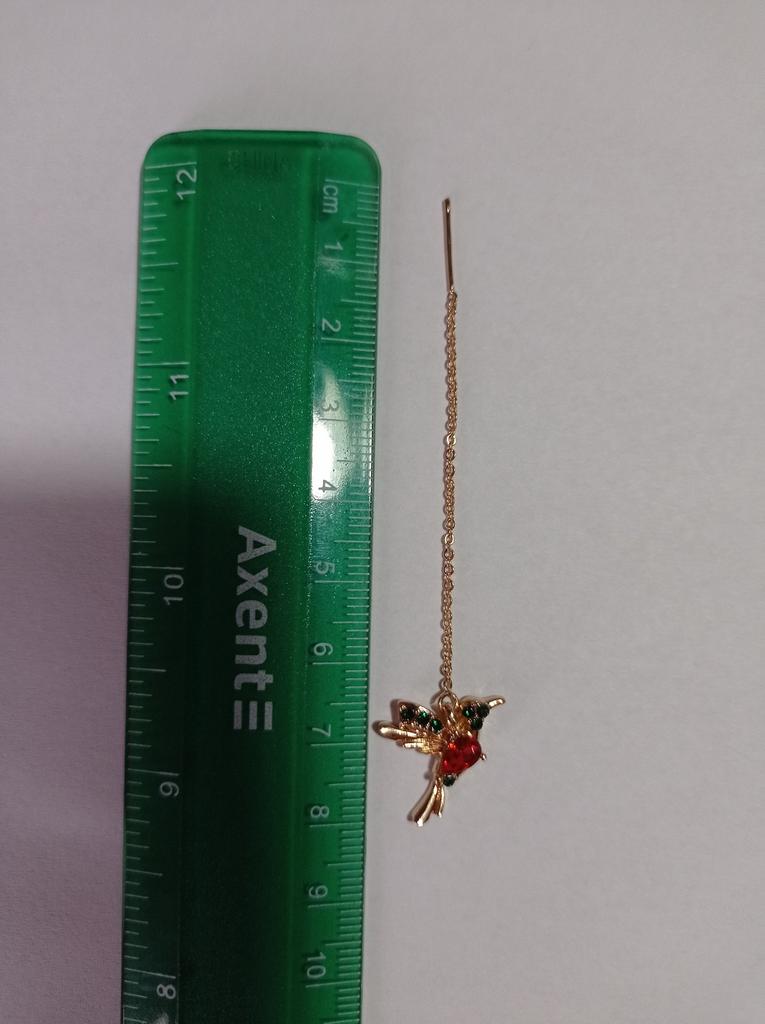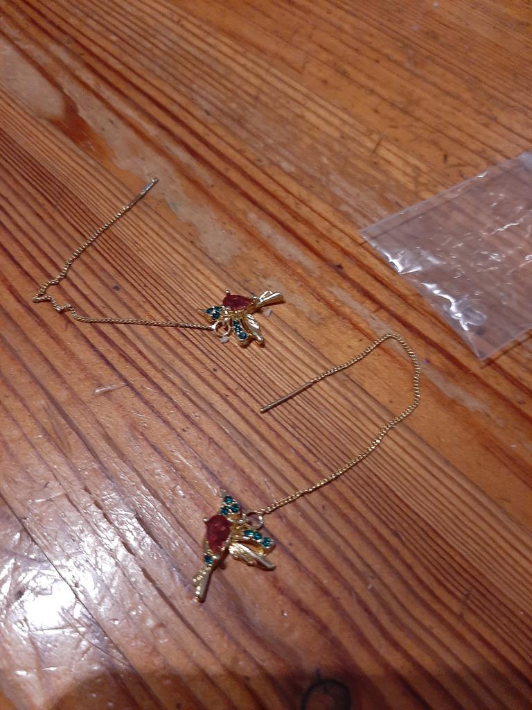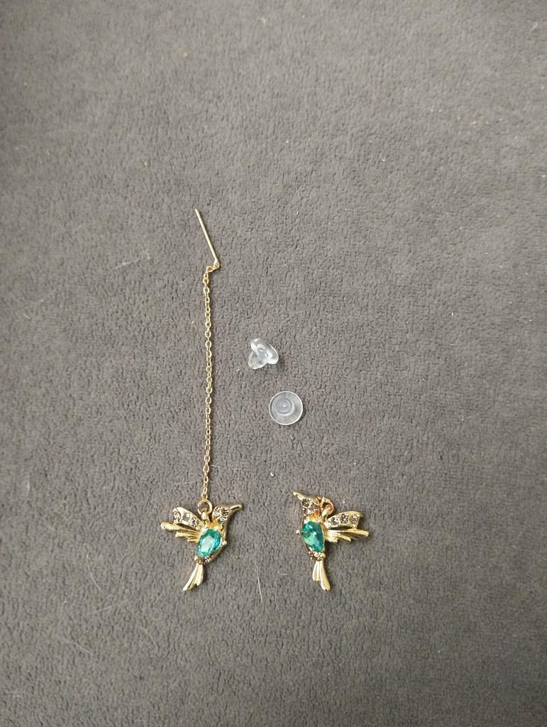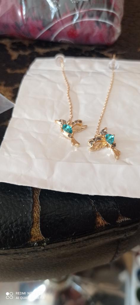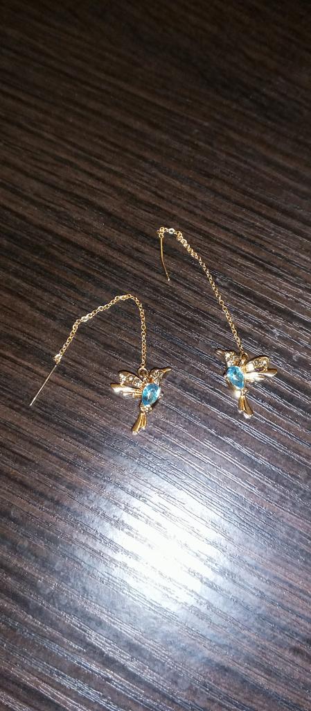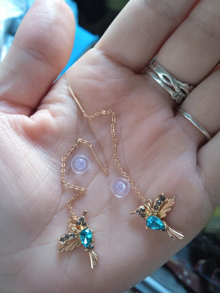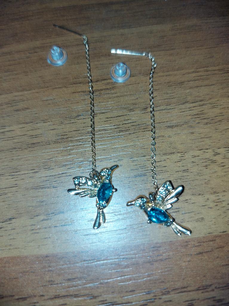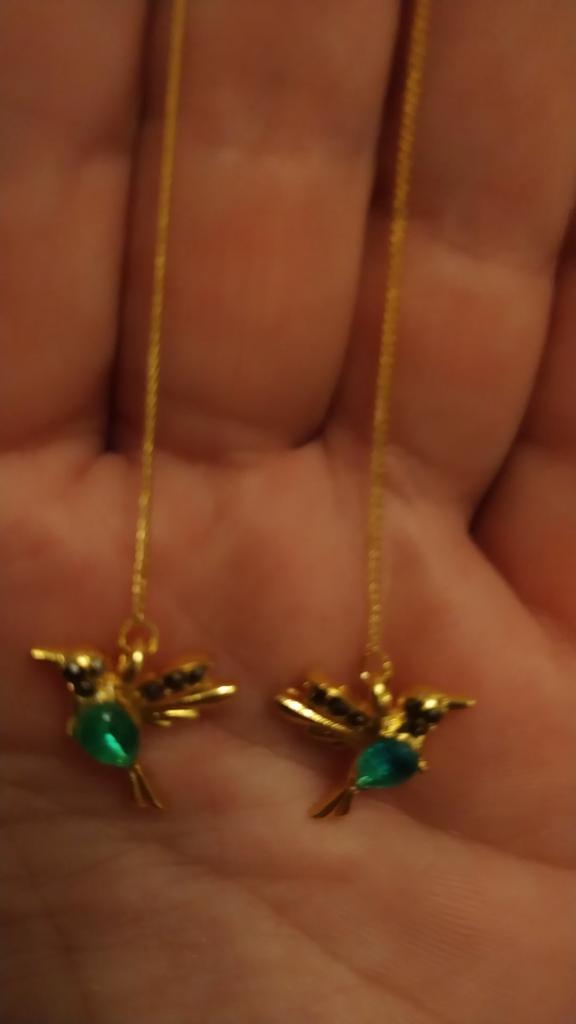 Kolczyki dotarły do celu w ciągu miesiąca. Nie mierzyłam, więc nie wiem, to normalne, ale długość całkowita od ptaka do końca to 5 cm, wydają mi się za krótkie, a kolor nie zgadza się ze zdjęciem - turkusowy