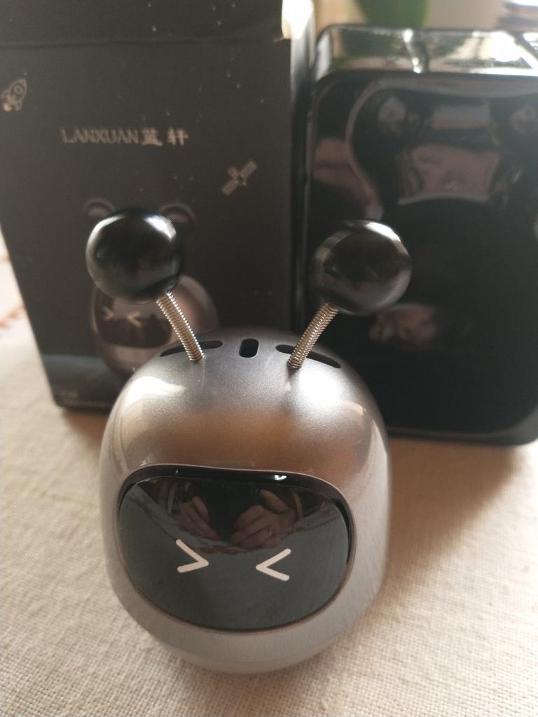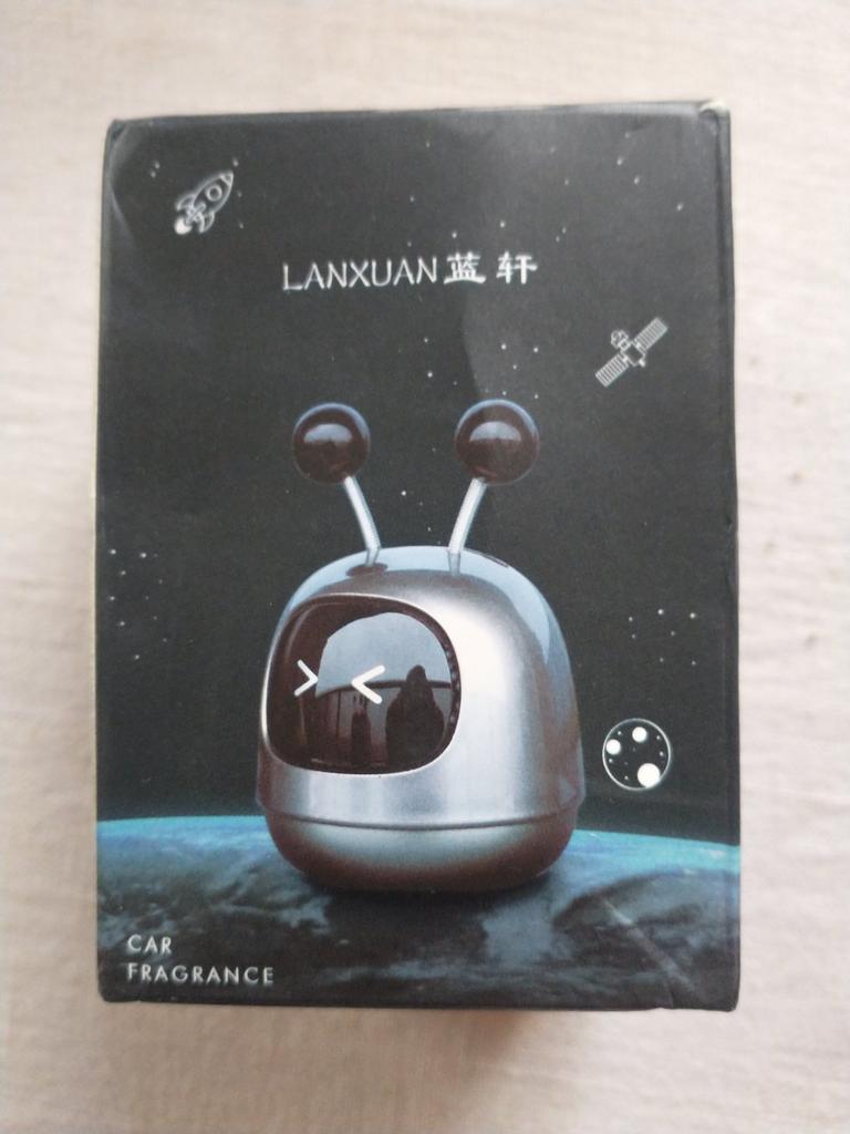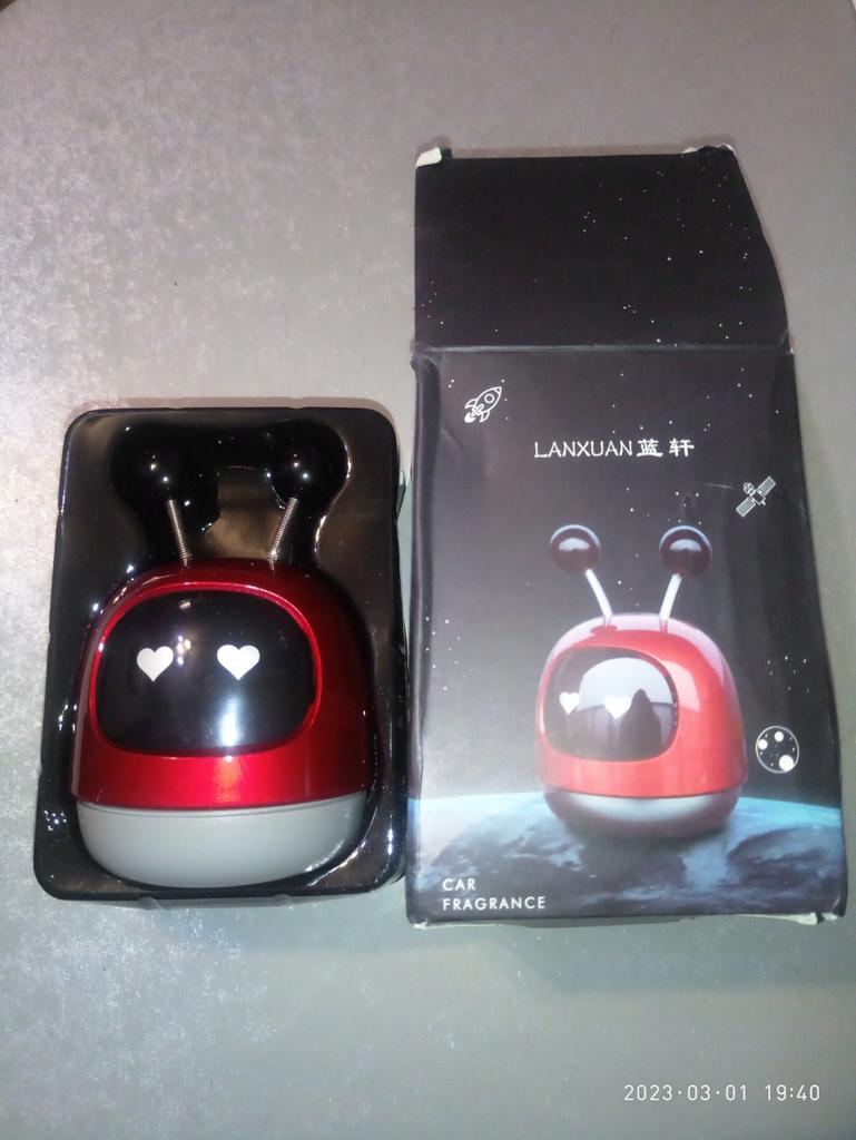 Samochodowy odświeżacz powietrza. Opakowanie okropne, wszystko przyszło pogniecione, ale sam robot nie ucierpiał. Sympatyczny robot z dwoma sprężynującymi rogami. Postawiłam w samochodzie, przykleja się na przyssawkę, trzyma się mocno. Zapach przyjemny, ale słaby. Gdzie kupować do niego wkłady wymienne — nie wiadomo. Ale robot jest zabawny)