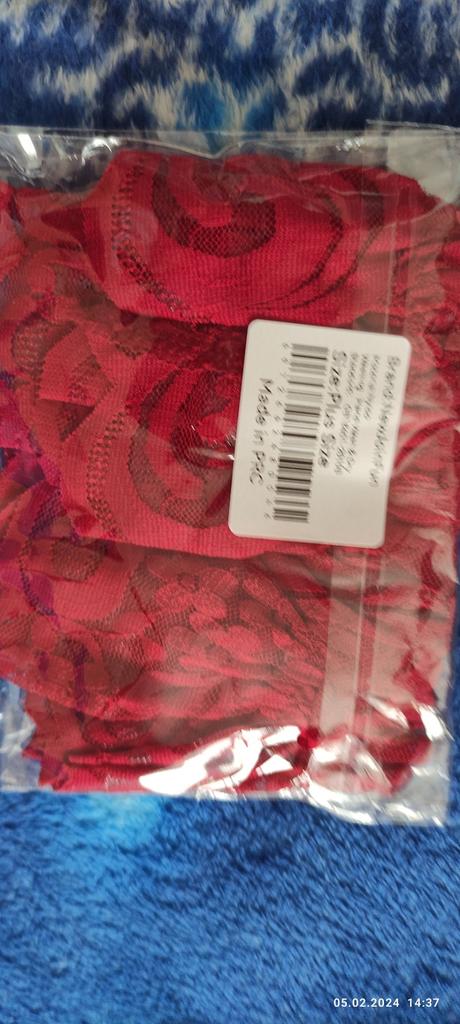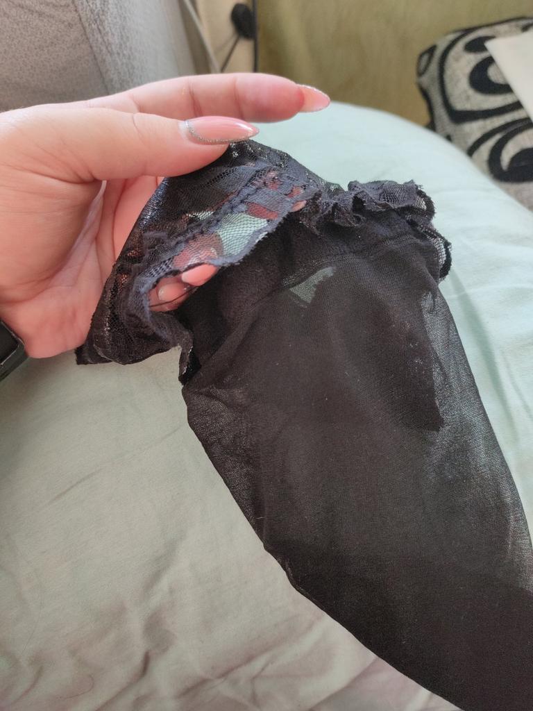 Uszkodzony nylon jest widoczny w pobliżu koronki. I to nie jest czerwony, ale bordowy.