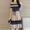 Koreańska moda Elegancki sweter z dzianiny Casual Dress Długi rękaw Lace-Up High End Stretch Knit Vintage Stripe Sukienki