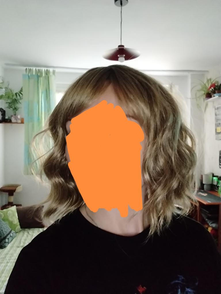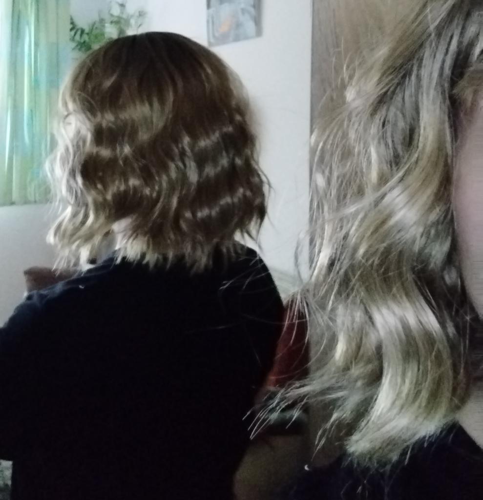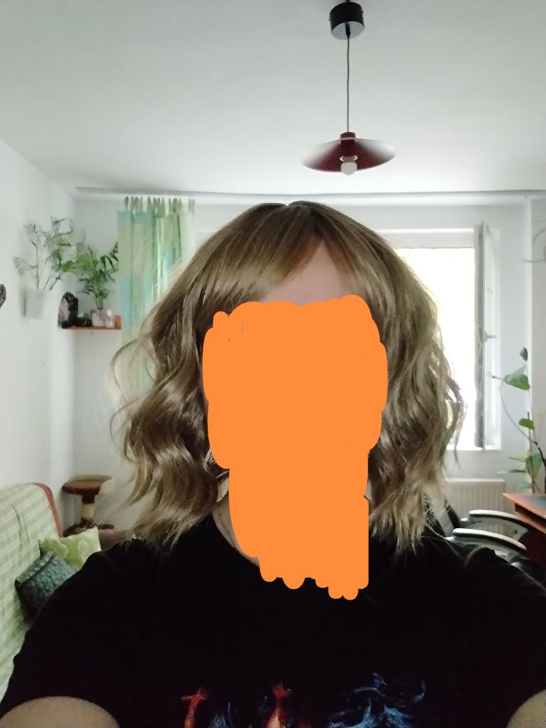 Perukę umyto szamponem i wyprostowano żelazkiem. Trzy ostatnie zdjęcia są już po metamorfozie. Przycięłam trochę grzywkę.