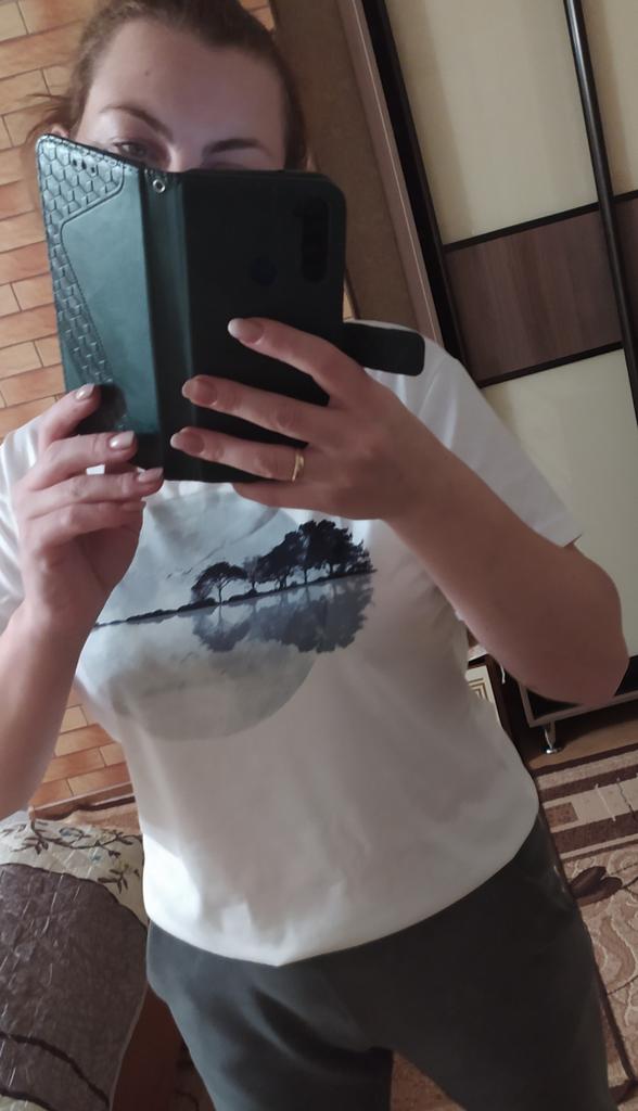 Bardzo ładna koszulka. Tkanina przyjemna w dotyku, nitki nie wystają, nadruk jest nieco mniejszy niż na zdjęciu. Przybył na czas.
