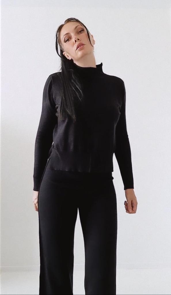 Jesień Zima Nowa Moda Przyczynowy Sweter Z Dzianiny Garnitur Jednolity Kolor Pół Wysoki Kołnierz Szerokie Spodnie Nogawki Dwuczęściowy Zestaw