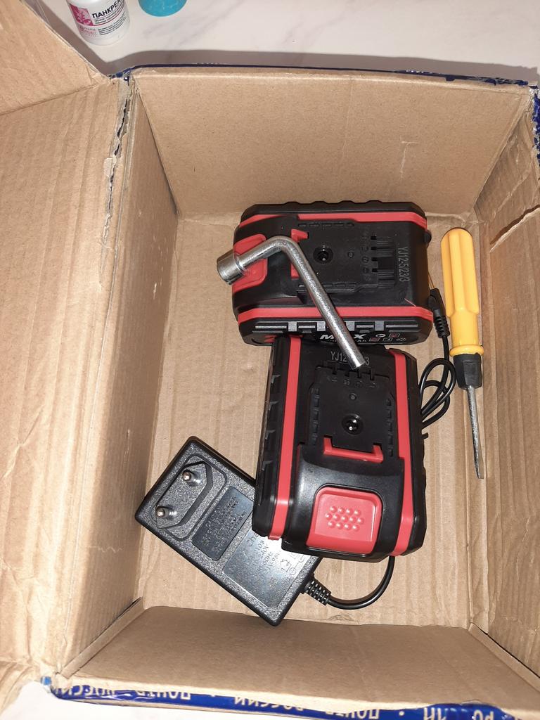 Towar otrzymałam, z 2 bateriami, ale są słabe - 21 V. Naładowania wystarczy na krótko.