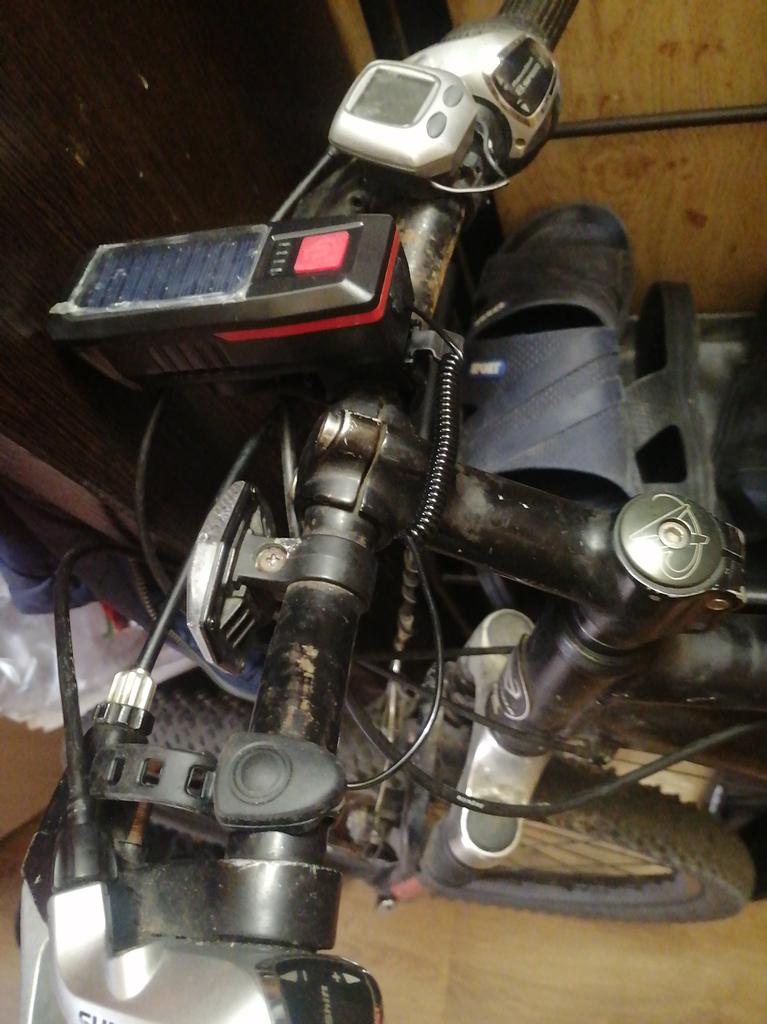 Mocne światło z diodą LED i małym ogniwem słonecznym. W zestawie także głośny róg. Ukradli mi go, więc kupiłem nowy.