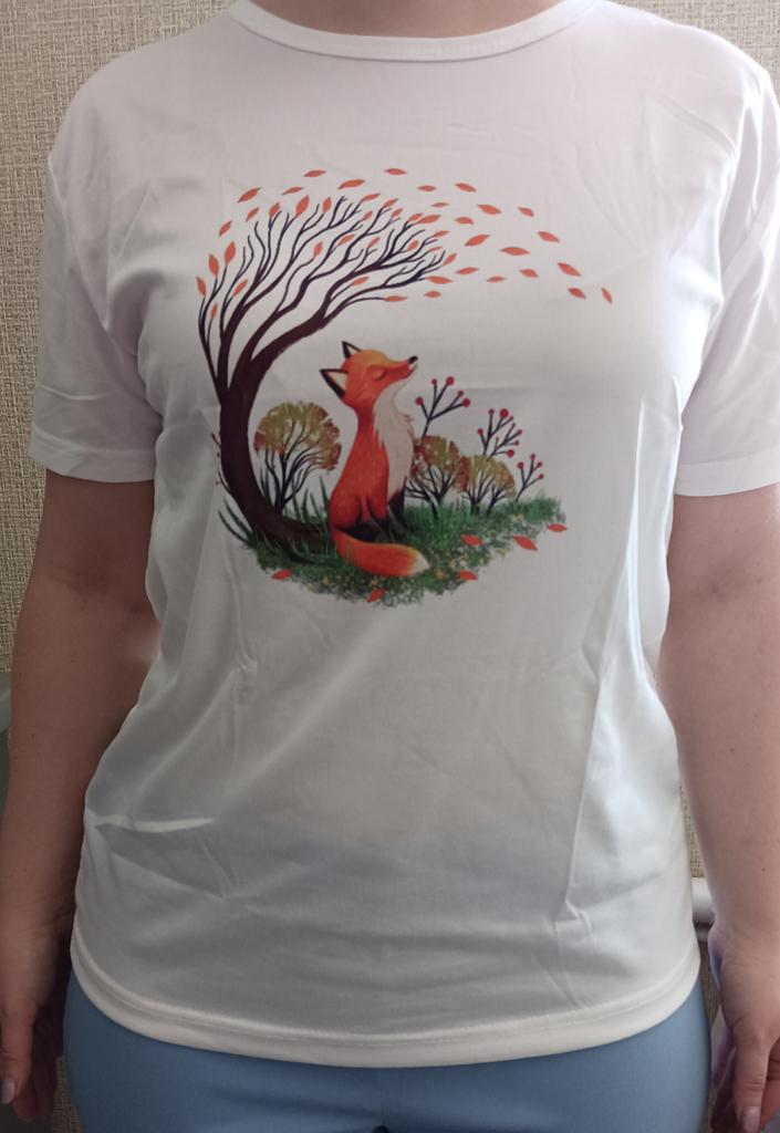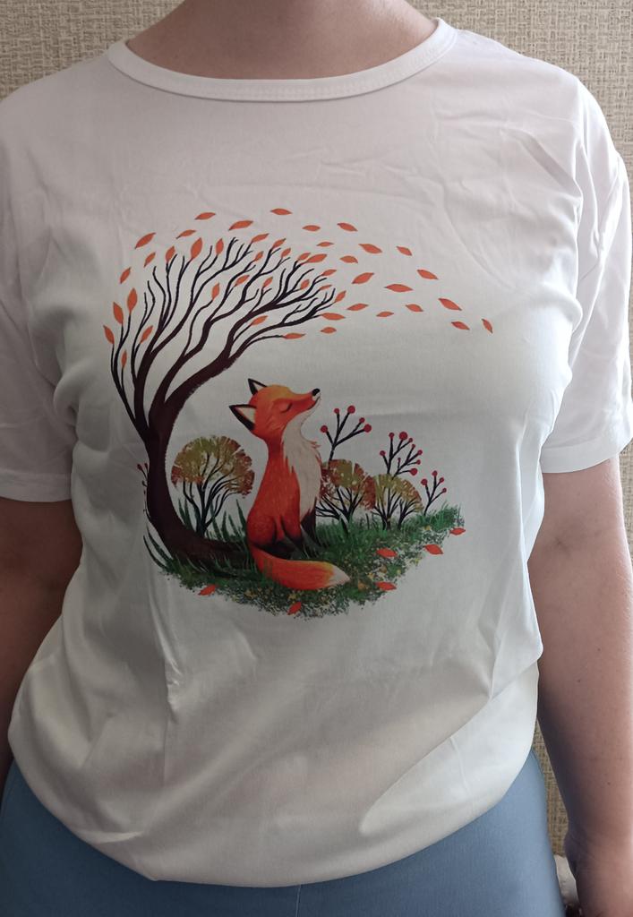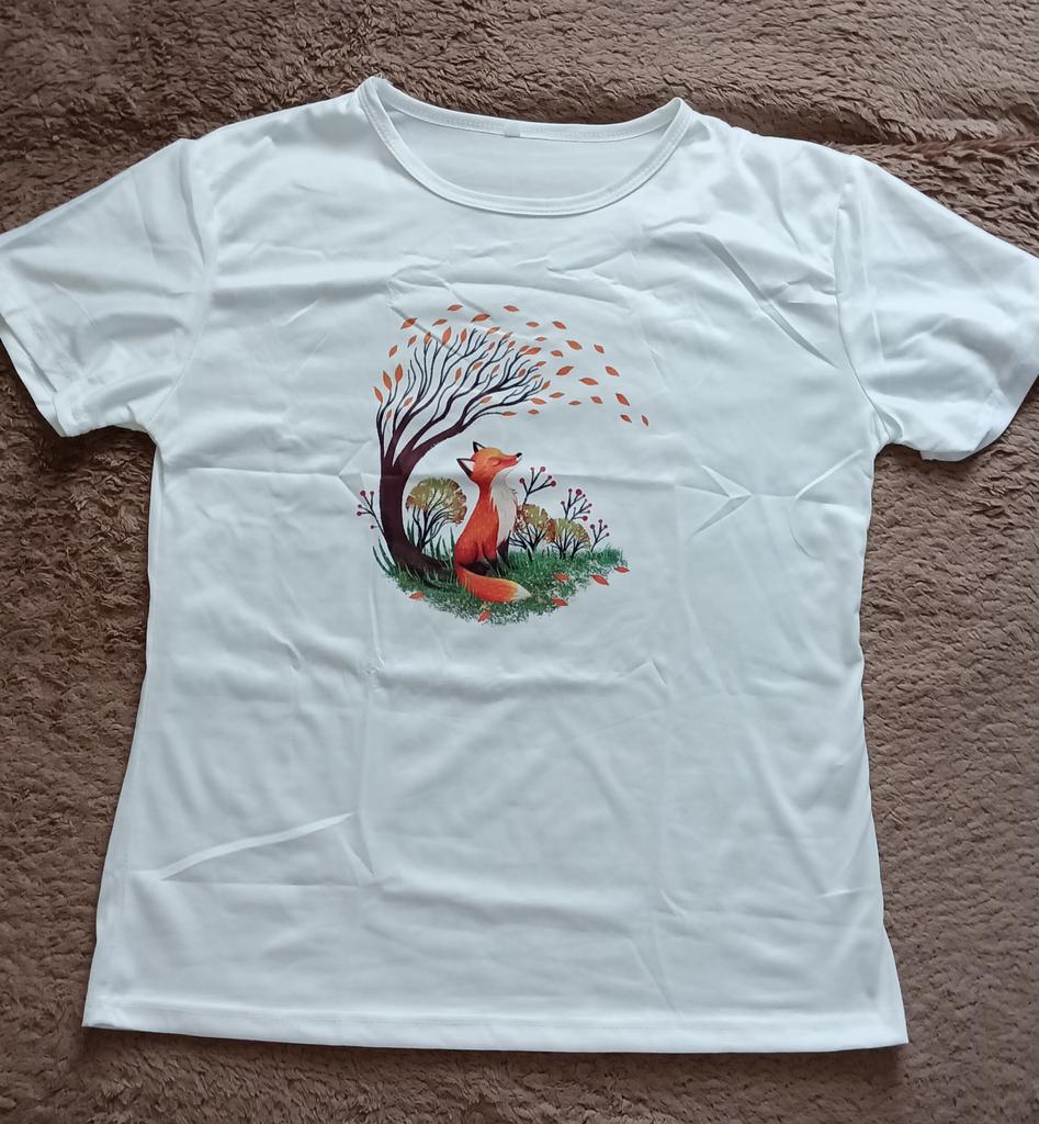 Wzór ładny, dość jasny, nie jest to naklejka, trochę błyszcząca jak zwykle na koszulki z tej półki cenowej, ale materiał przyjemny dla ciała, lekki, dobry na upalne dni. Specjalnie kupiłam rozmiar większy, żeby była luźna i nie obcisła, bardzo spodobał mi się wzór, uroczy lis. Nie wygląda źle, trochę pognieciony od opakowania, ale jak go wyprasuję będzie super. Za tę cenę jest całkiem nieźle. 👍 🙂