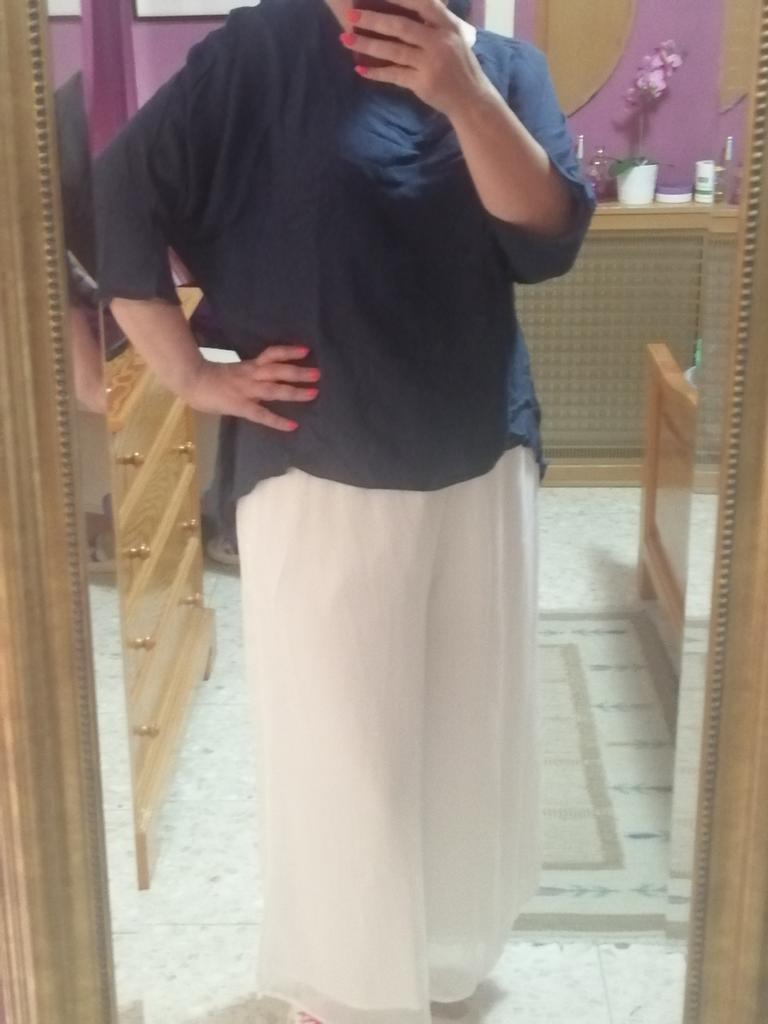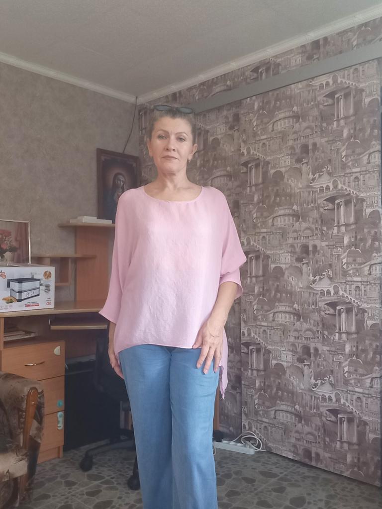 Nie jestem pewien co do tego topu. Na zdjęciu wygląda trochę inaczej, materiał i wygląda na dłuższy. Materiał bardzo lekki, trochę cienki, bardzo prześwitujący. Zawiedziony, że jest dość krótki, zamówiłem rozmiar S na 103 cm, pasuje ok. Ma bat 3 /4 rękawy, okrągły dekolt, oversize. Szybka dostawa, udanych zakupów.