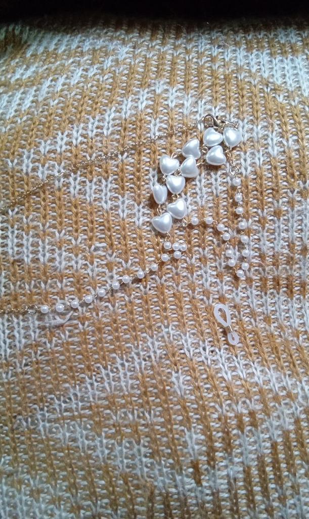 Opakowanie wysyłkowe dziurawe, porwane. Łańcuszek do okularów porwany, w czesciach koraliki rozsypane. Tragedia.