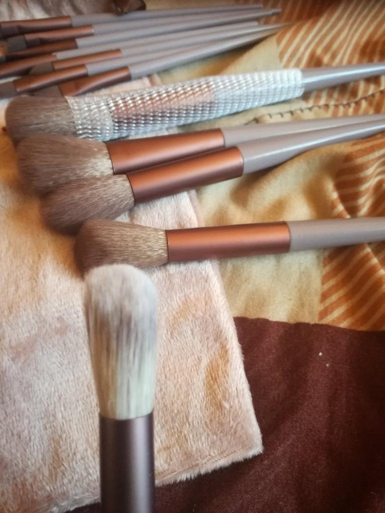 Do różu ma odstający włosek,w dotyku włosie pędzli miękkie,czekają na makijaż.Tylko do pudru miał osłonkę cześciowo założona.Reszta bez w woreczku z weluru.