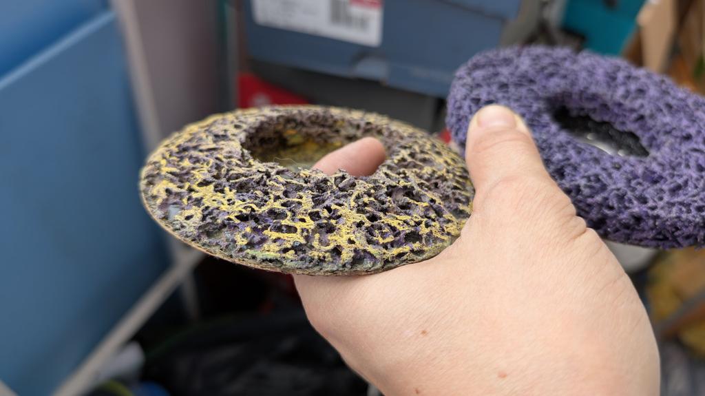 Godna tarcza koralowa..w ciągu roku oj jak dużo farby zczyściła z różnych powierzchni na placu i dużo oczyściła profili i rur z rdzy 🤟🤟🤟 Używałem szlifierki kątowej z regulatorem obrotów, prędkość była średnia..