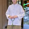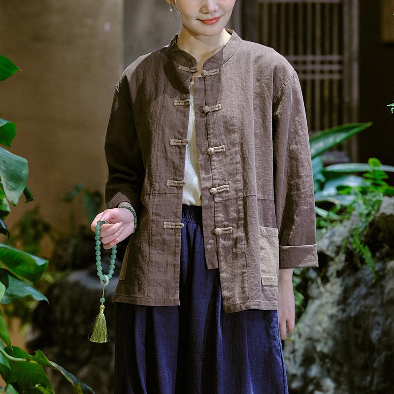 Johnature Damskie koszule w stylu chińskim Topy lniane patchworkowe kieszenie wiosenne bluzki stoją koszule damskie z długim rękawem