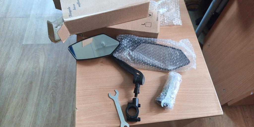 Prima lusterko z akcesoriami montażowymi, niestety brakuje mi gumy, która chroni kierownicę przy obejmie.