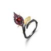 Gb 925 Srebro Czarne Złote Ręcznie Robione Pączek Kwiat Otwarty Pierścień Płonące Serce Naturalny Granat Kobieta Regulowany Kamień Szlachetny Pierścień
